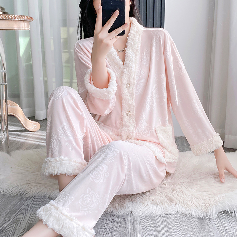 海岛绒长袖长裤睡衣女秋冬季新款高级感蝴蝶压花双面绒家居服套装