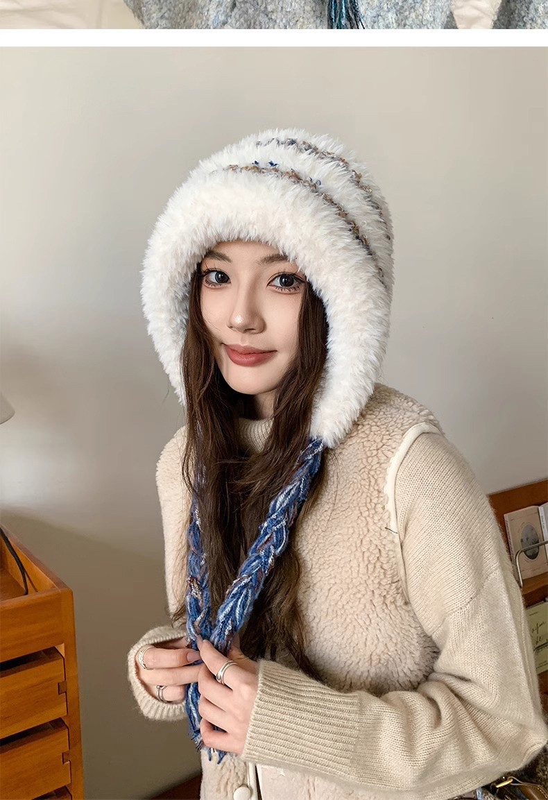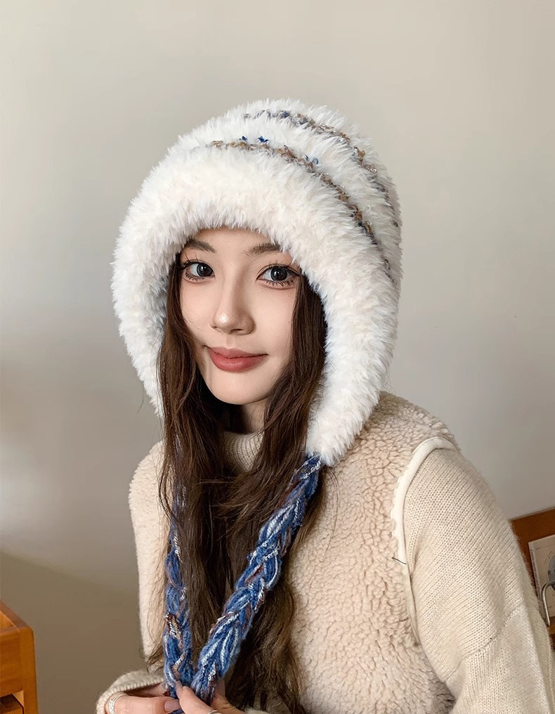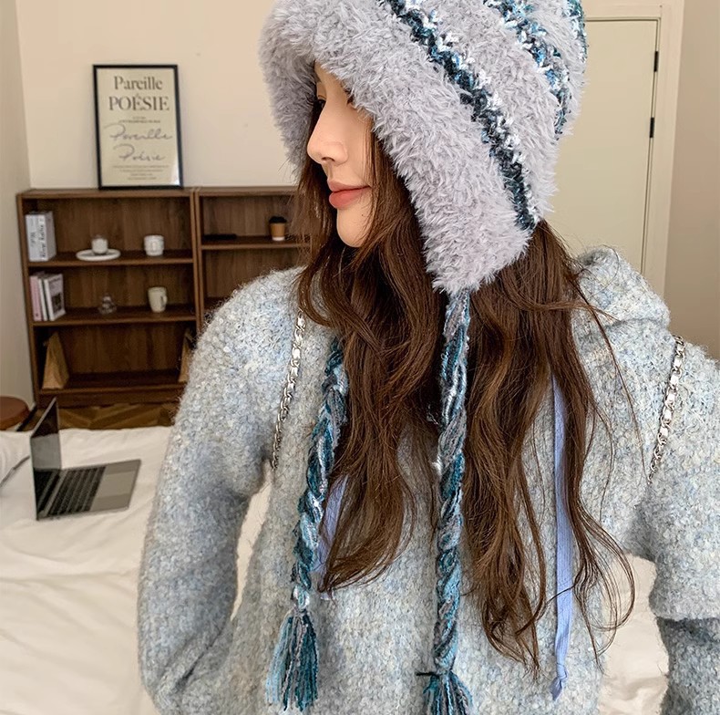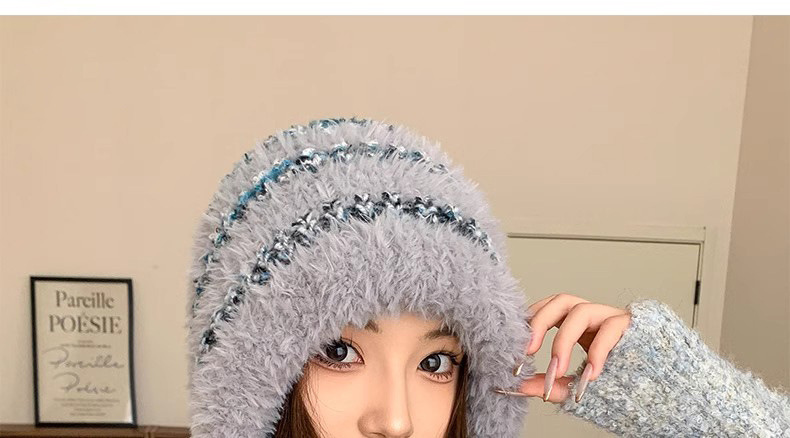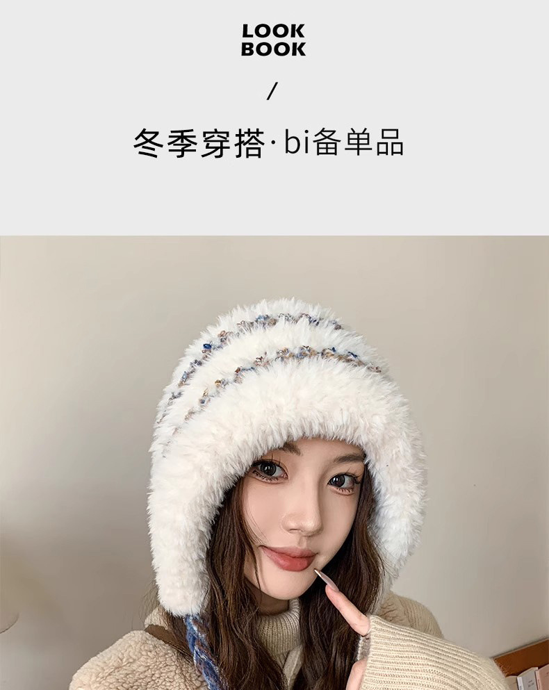 毛绒绒条纹帽子女显脸小针织帽保暖韩版可爱护耳毛线帽逛街大头围