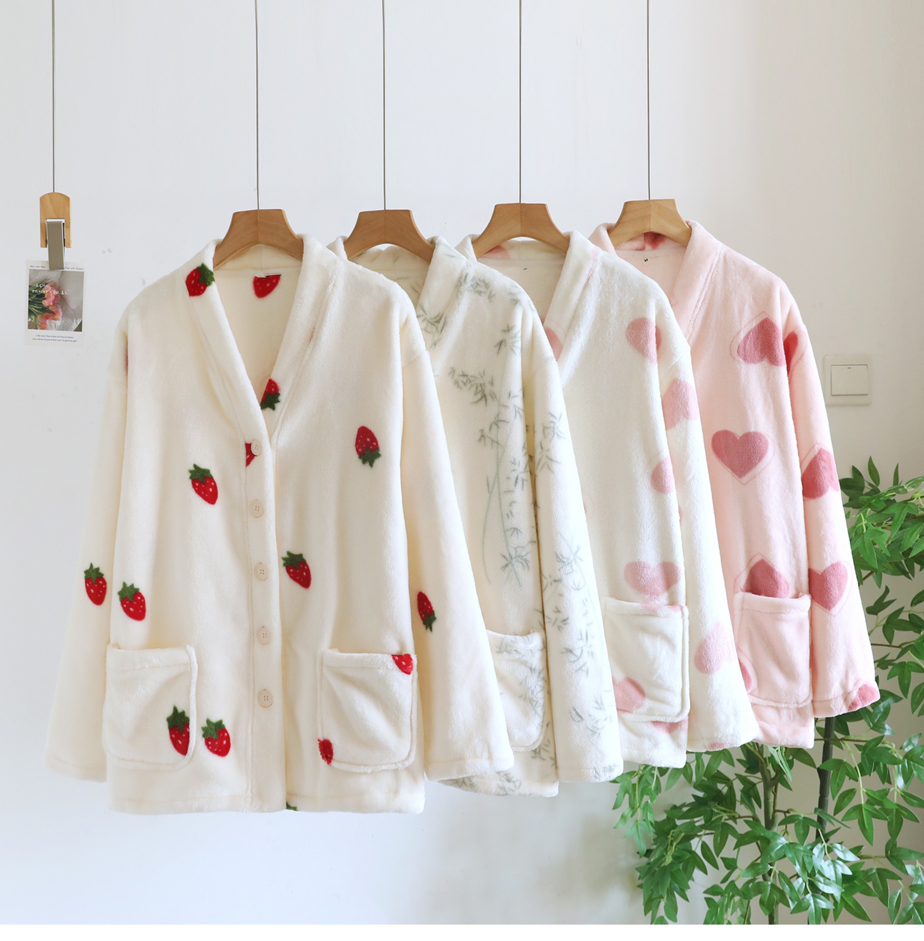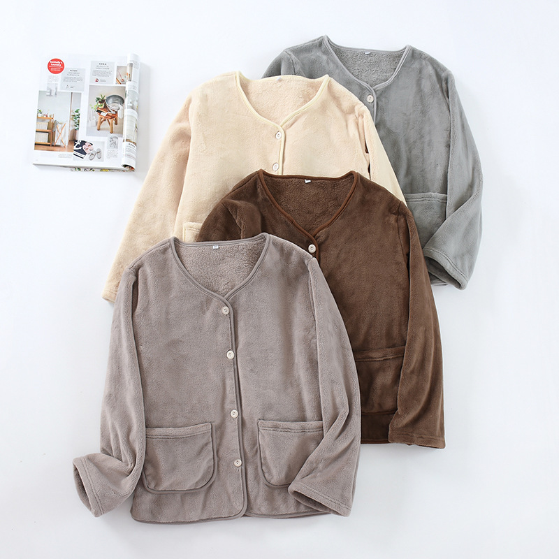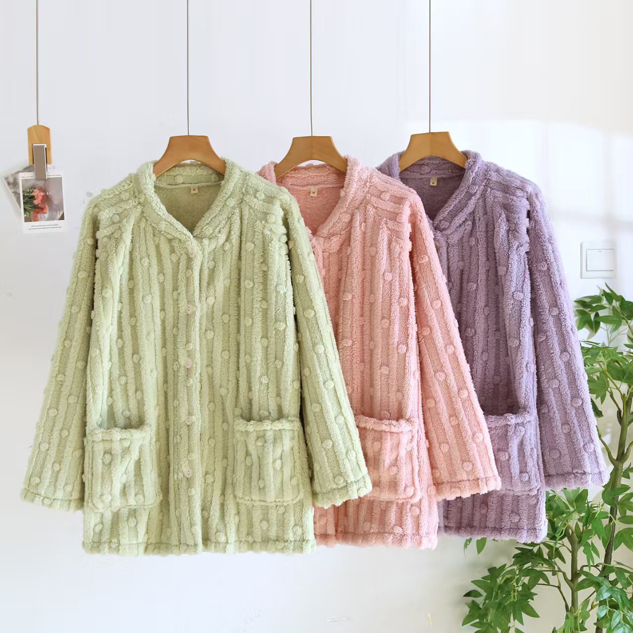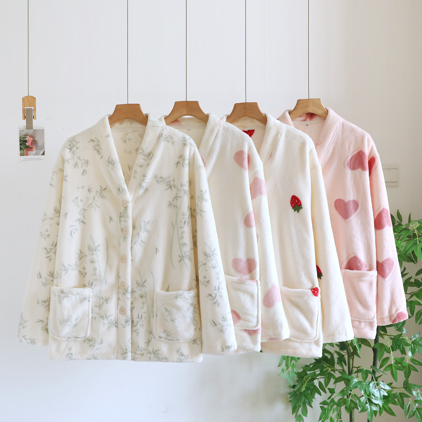 秋冬フランネルの上着の女性は保温のワンピースのパジャマの長袖のカーディガンを厚くします。