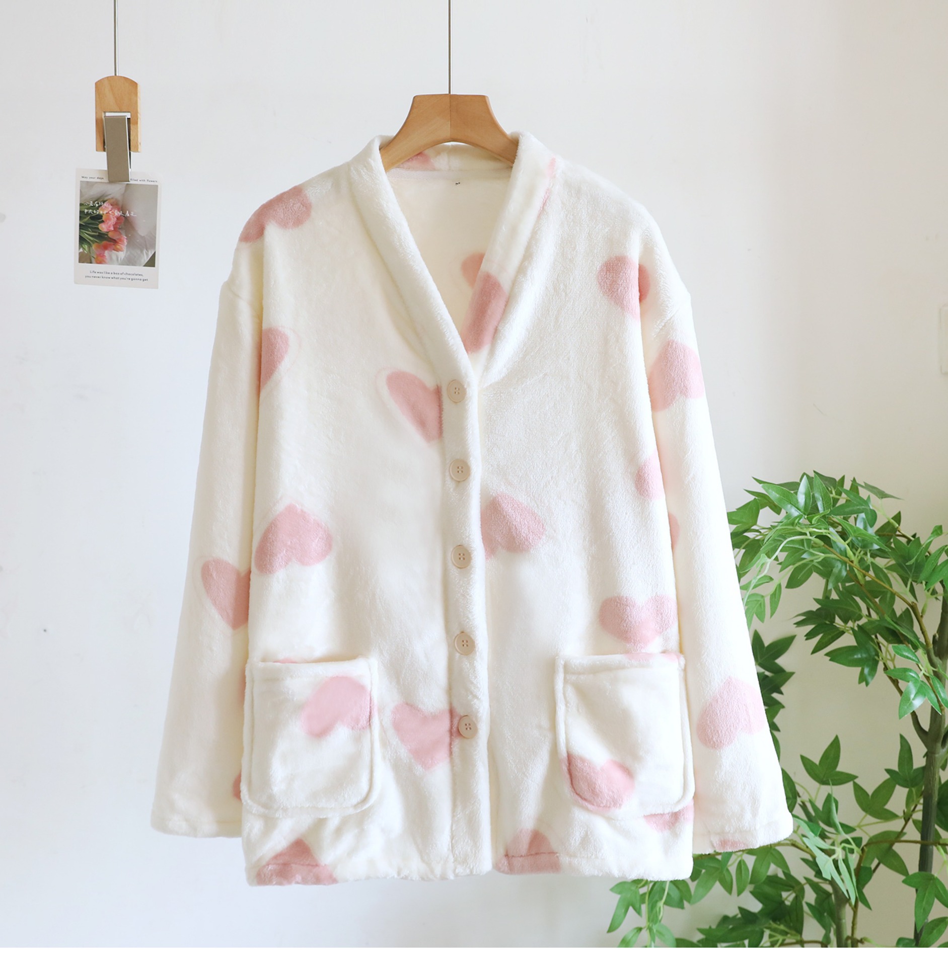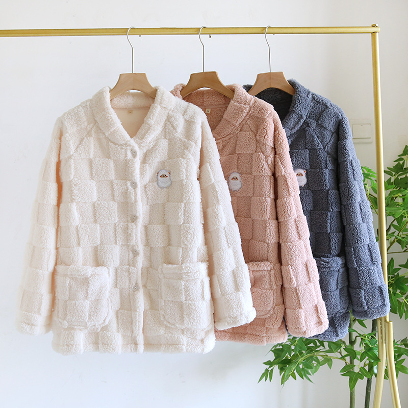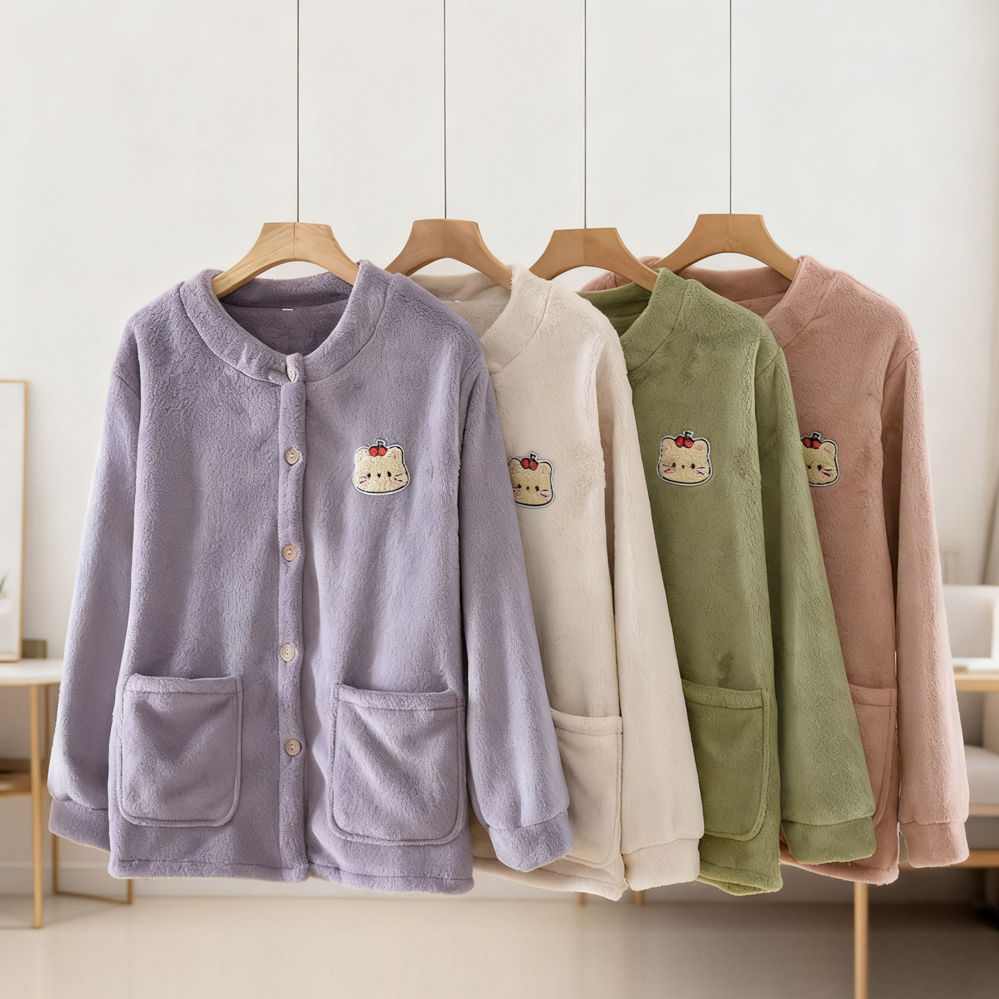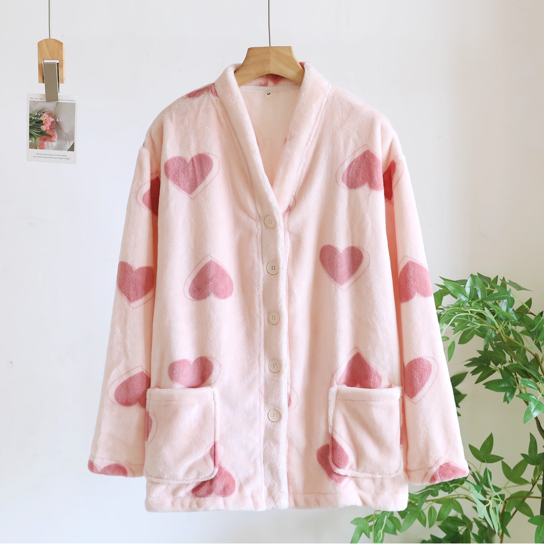 秋冬フランネルの上着の女性は保温のワンピースのパジャマの長袖のカーディガンを厚くします。