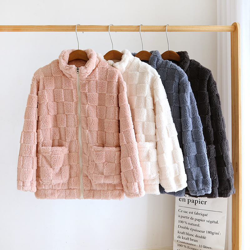纯色法兰绒女睡衣单件上衣秋冬季拉链长袖开衫加厚珊瑚绒休闲外穿