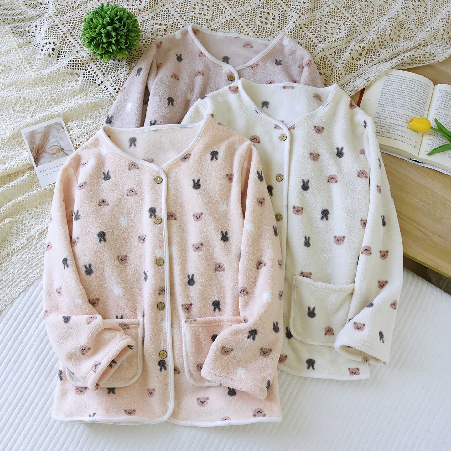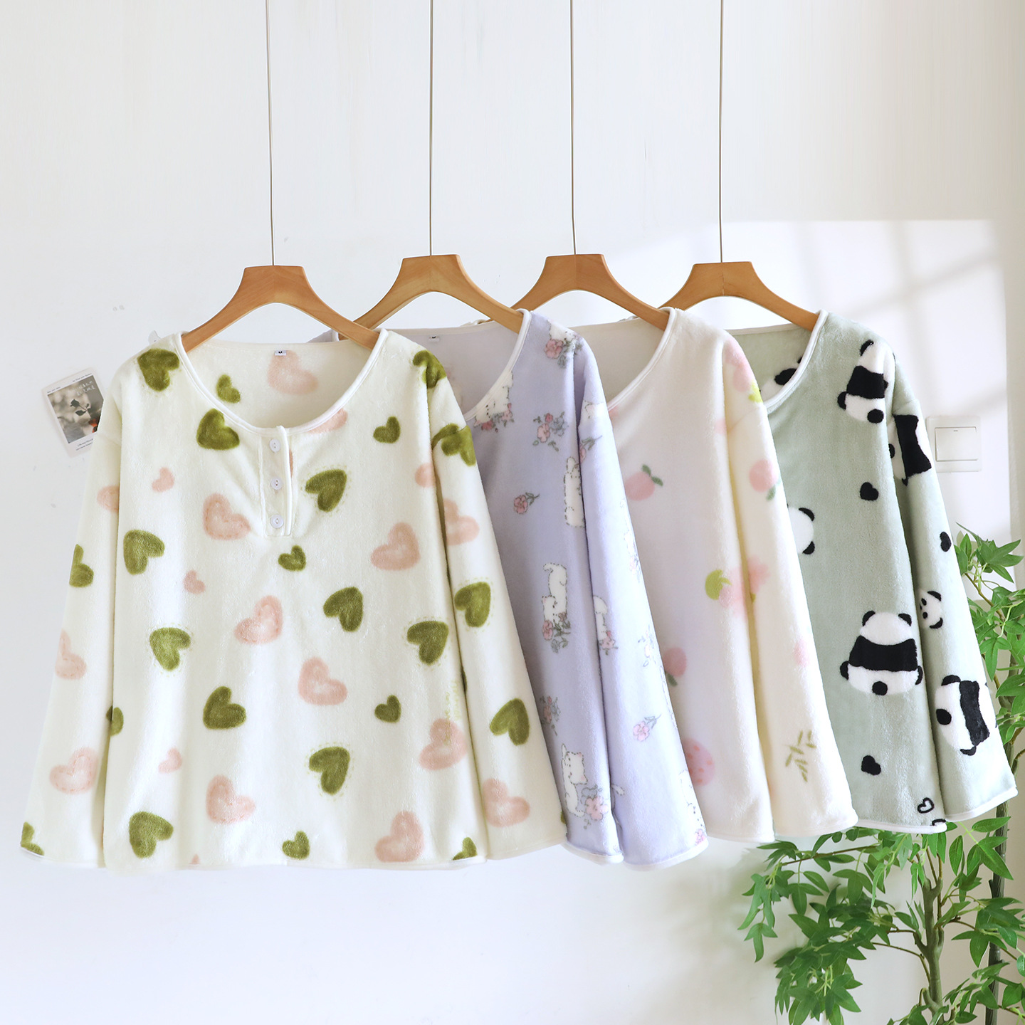 睡衣上衣女冬季加厚法兰绒保暖加绒珊瑚绒简约卡通小兔厚款家居服