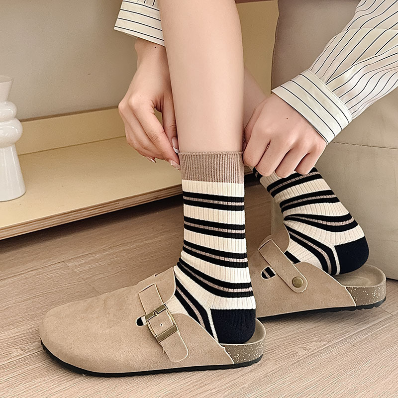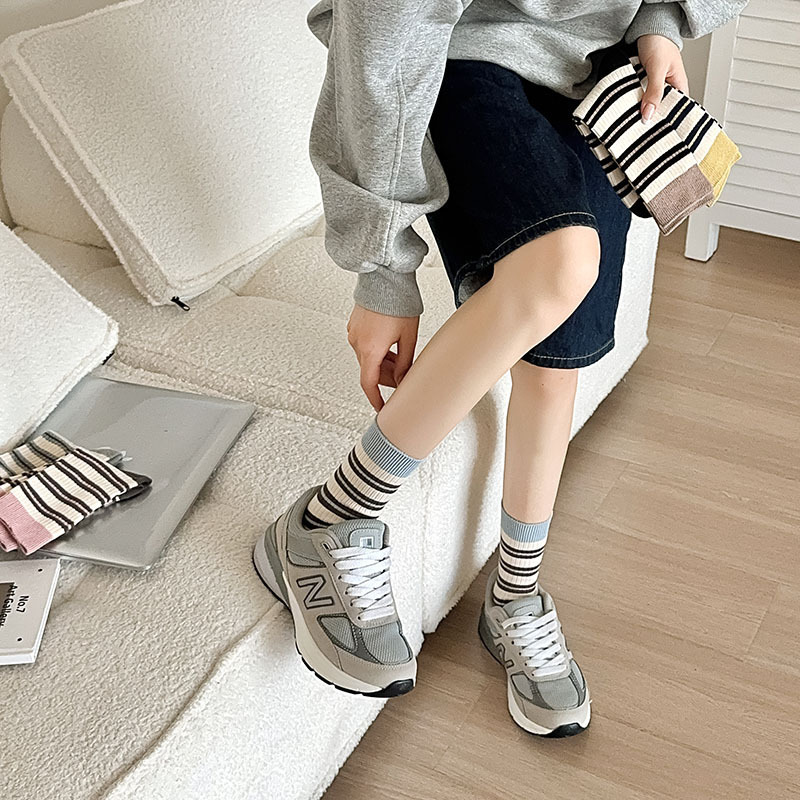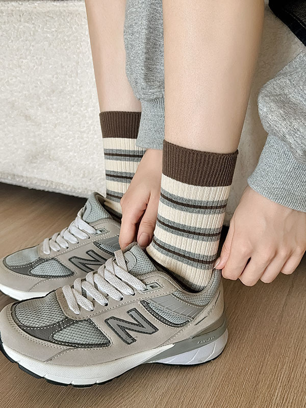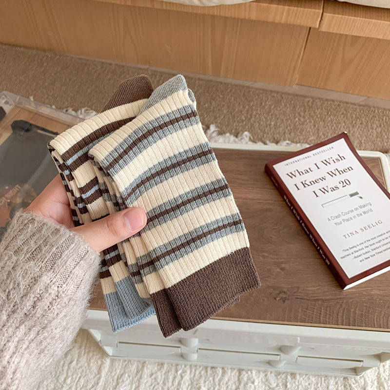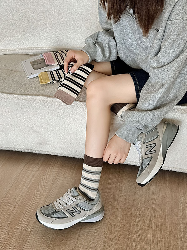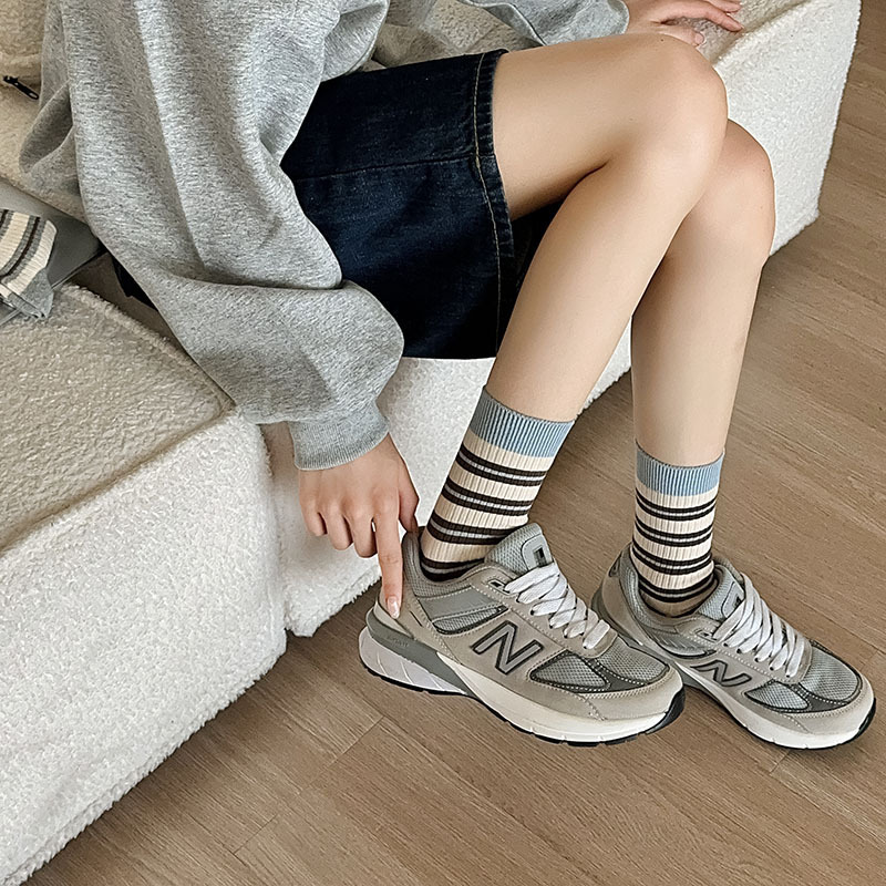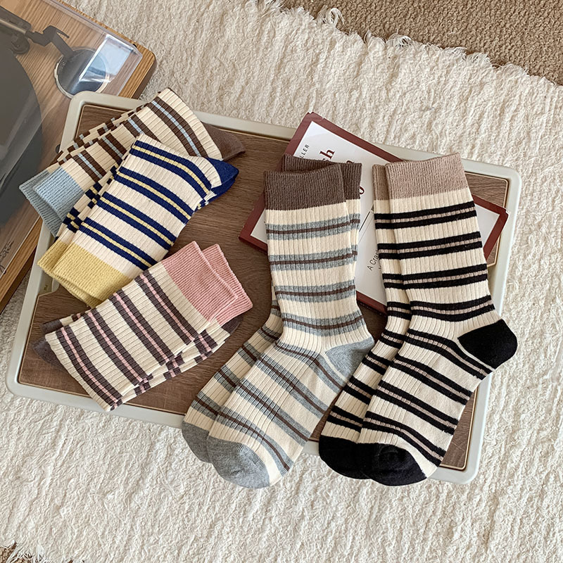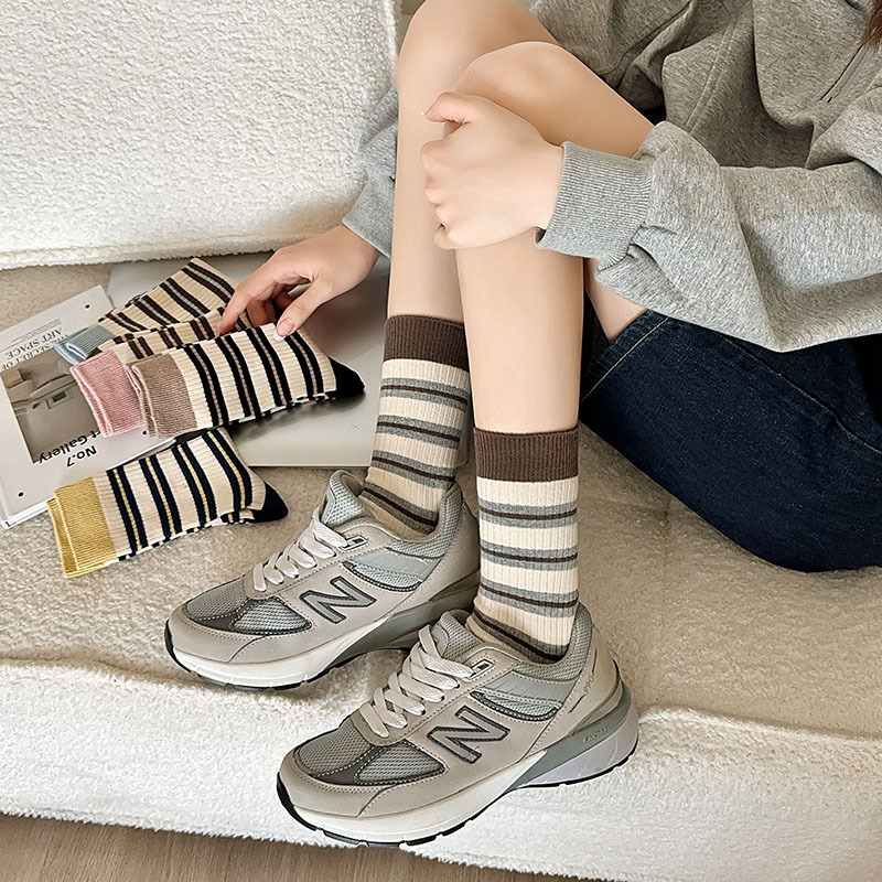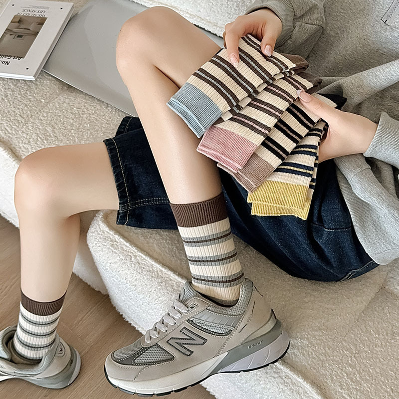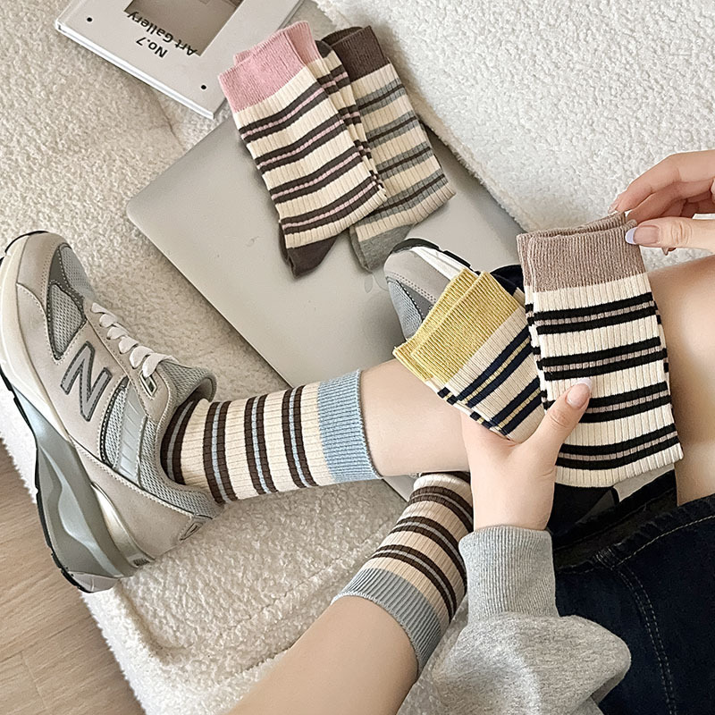 美拉德复古撞色条纹袜子女纯棉针织中筒袜ins潮日系长筒袜堆堆袜