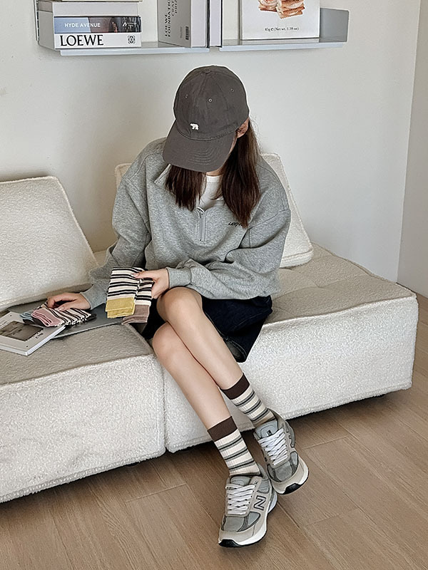 miu系灰蓝布标条纹堆堆袜女撞色复古中筒袜ins韩系百搭纯棉长筒袜