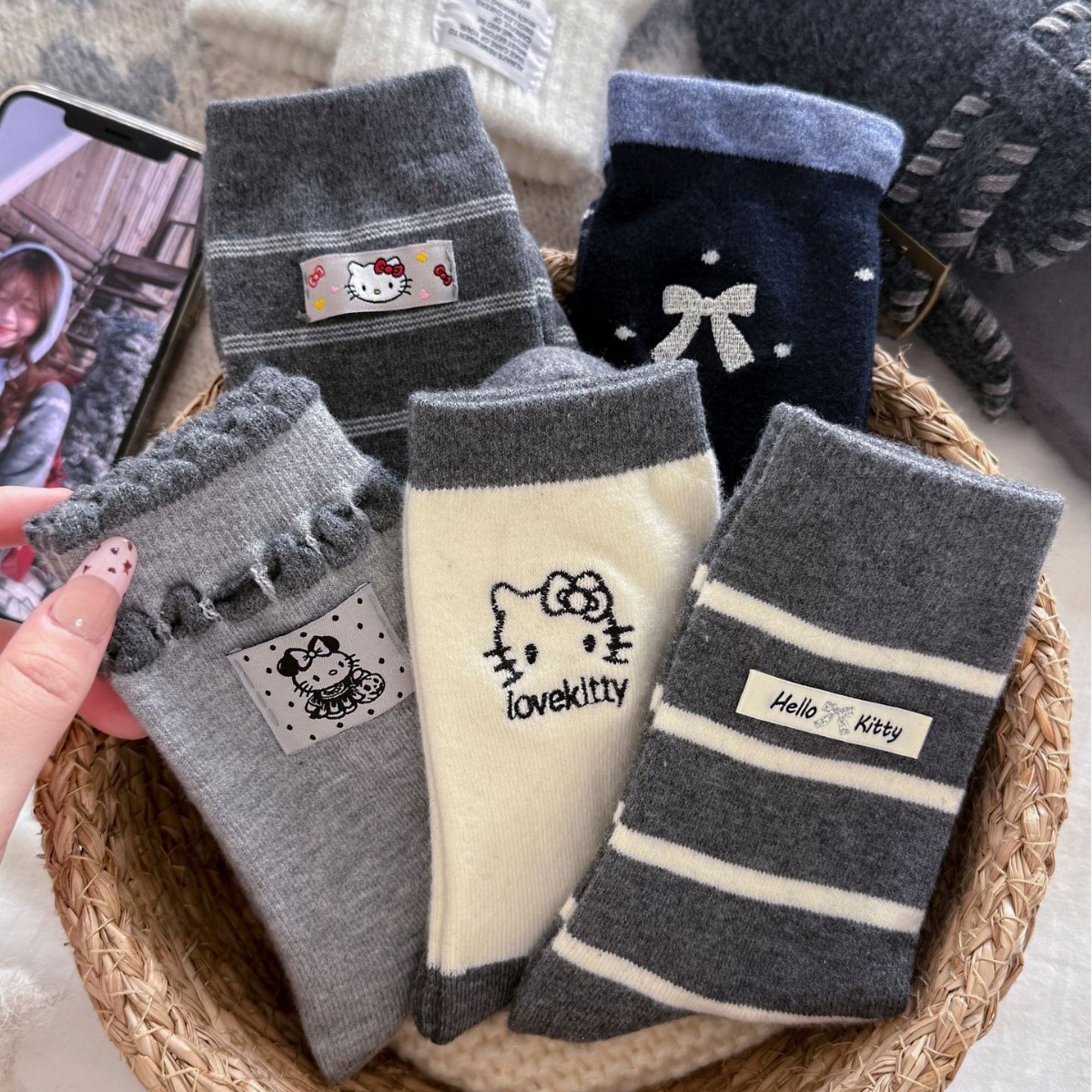 无骨羊毛袜子女灰蓝系中筒袜冬季加厚保暖可爱卡通刺绣条纹堆堆袜