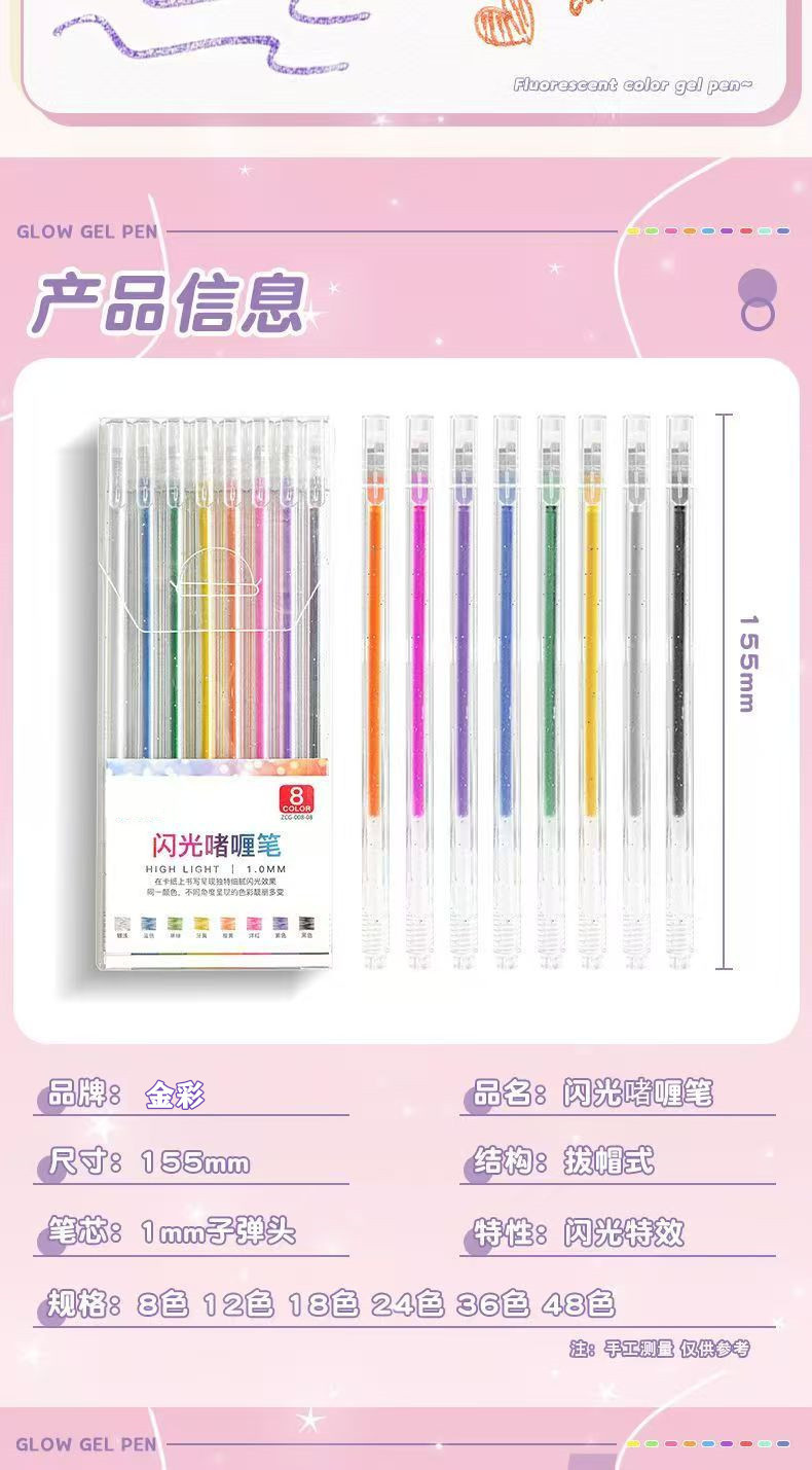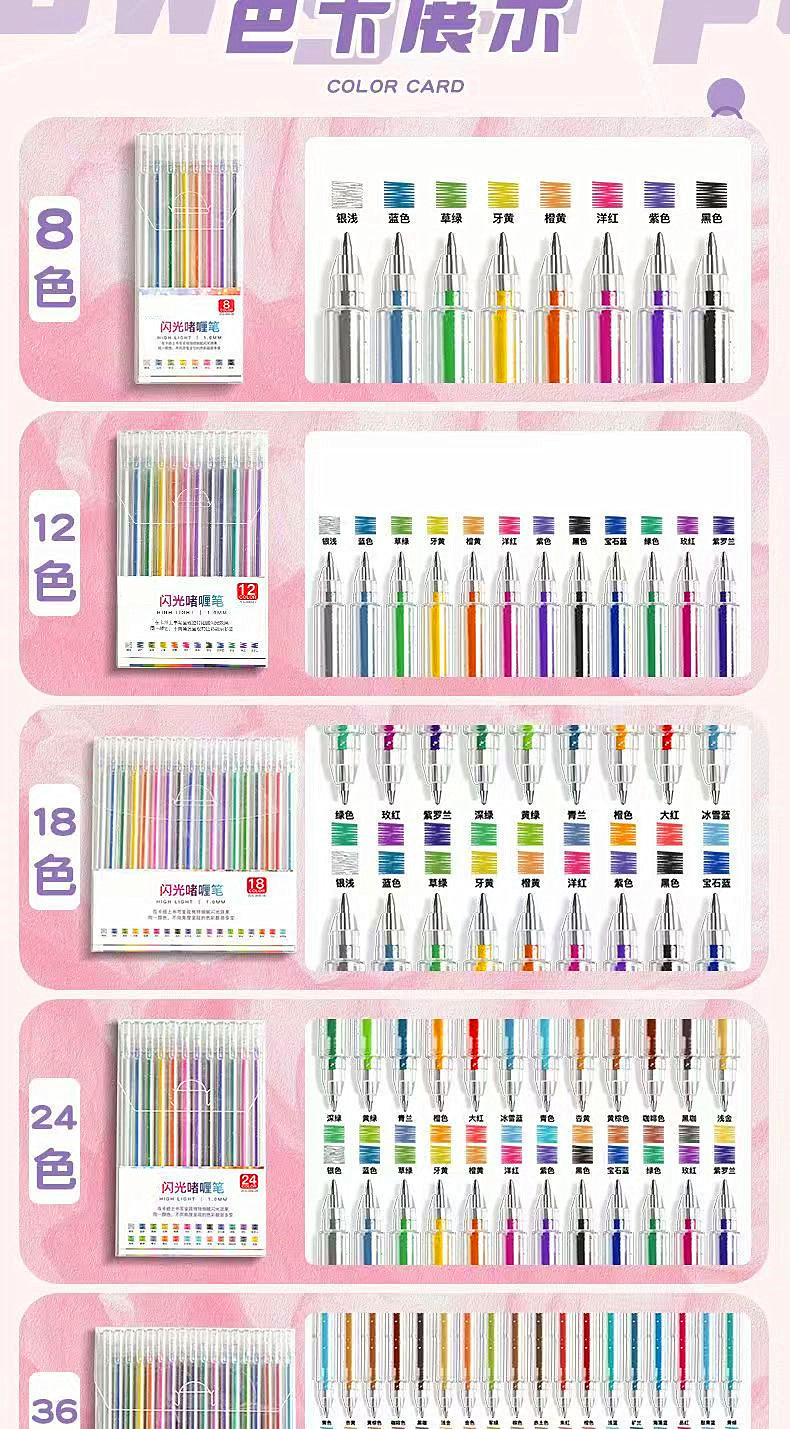 笔芯颜色 8色*【金属闪光啫喱笔精品套装】,12色*【金属闪光啫喱笔精品套装】,18色*【金属闪光啫喱笔精品套装】,24色*【金属闪光啫喱笔精品套装】,36色*【金属闪光啫喱笔精品套装】,48色*【金属闪光啫喱笔精品套装】