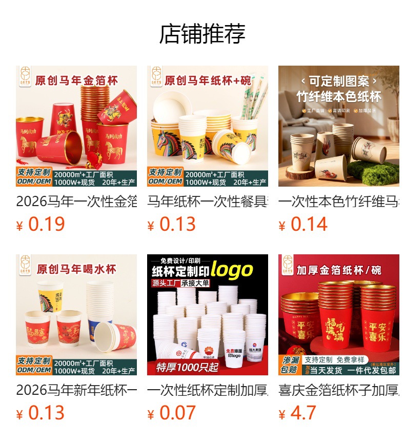 2026马年新年纸杯一次性食品级加厚杯子整箱批发可定制过年喝水杯