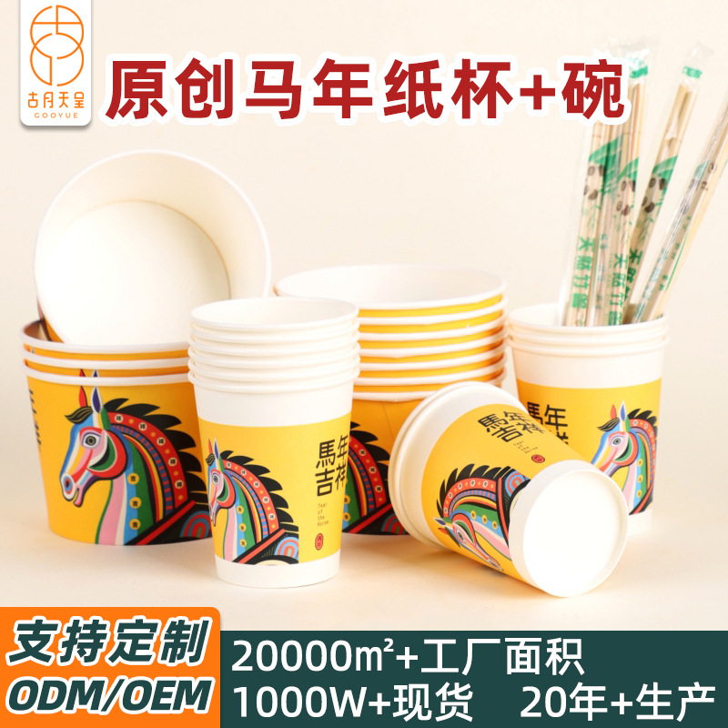 马年纸杯一次性餐具套装加厚喝水小吃喜庆纸碗家用过年春节用杯子