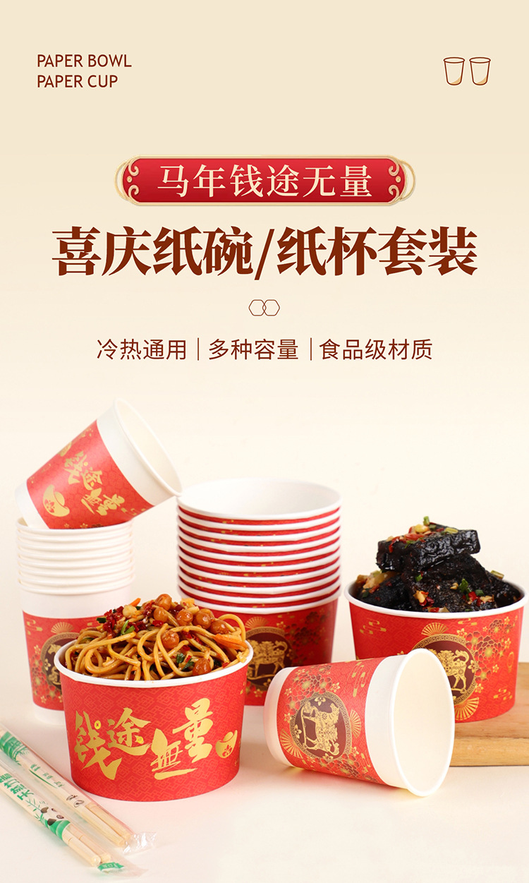 2026马年纸杯一次性餐具春节新年打包纸碗聚会家用加厚碗筷套装