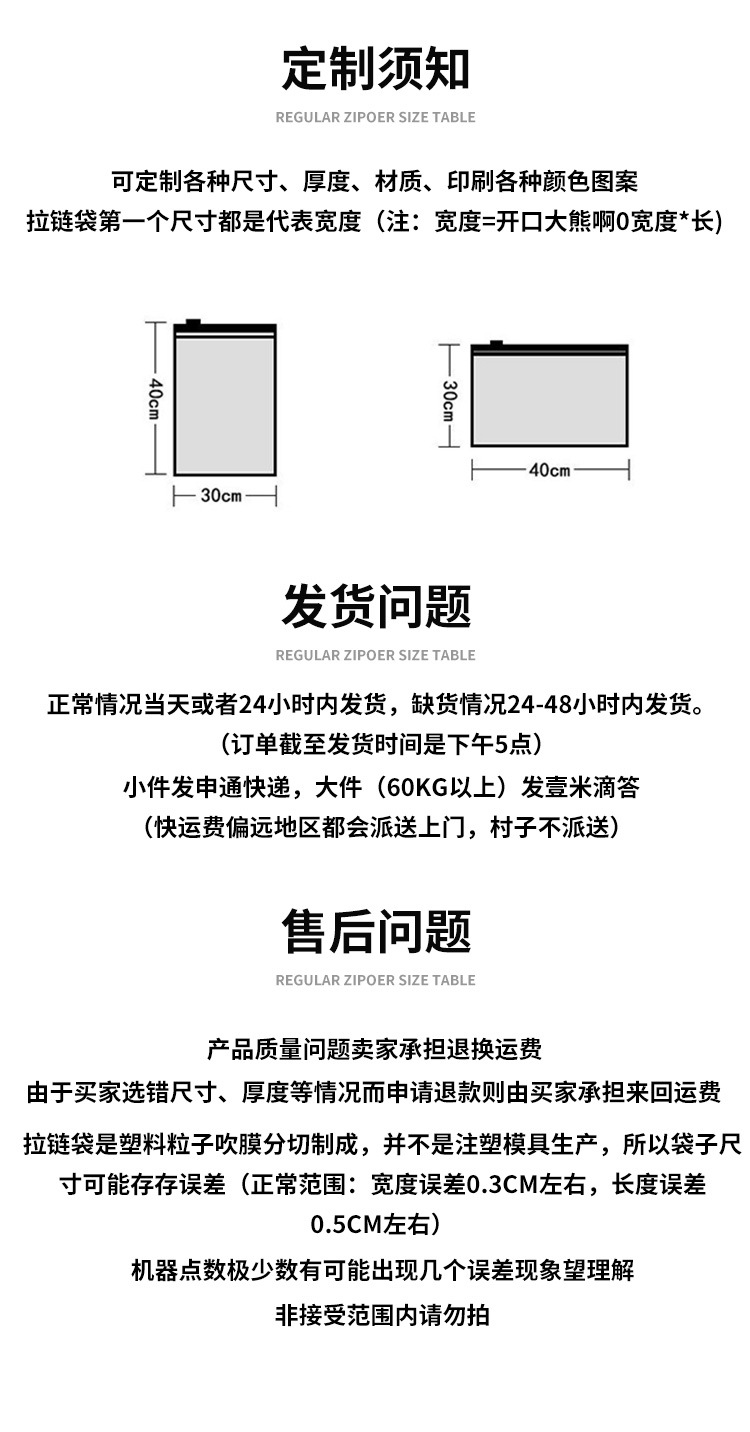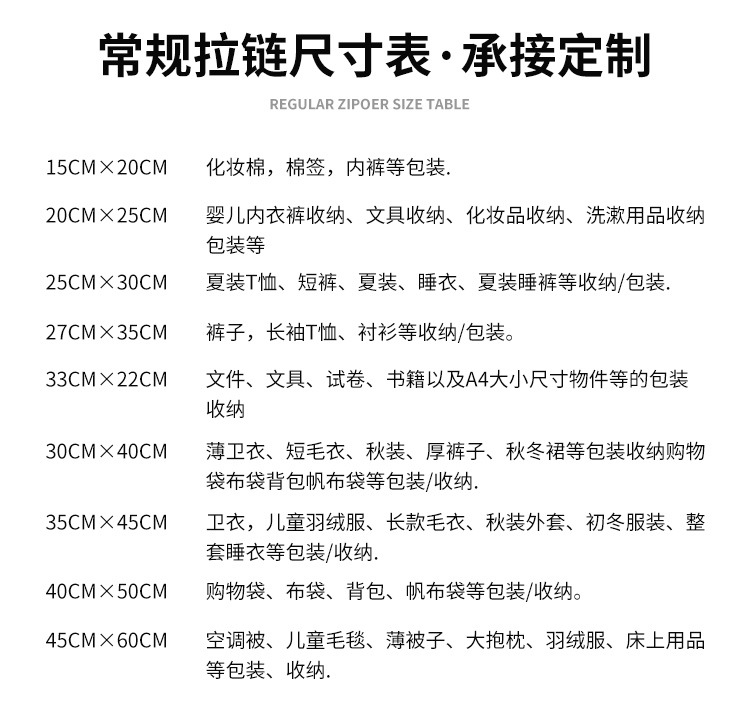 规格型号 一面磨砂一面透明【50个】14丝;一面磨砂一面透明20*25竖版;拉链袋PE+EVA,一面磨砂一面透明【50个】14丝;20*30竖版;拉链袋PE+EVA,一面磨砂一面透明【50个】14丝;25*30竖版;拉链袋PE+EVA,一面磨砂一面透明【50个】14丝;25*35竖版;拉链袋PE+EVA,一面磨砂一面透明【50个】14丝;25*40竖版;拉链袋PE+EVA,一面磨砂一面透明【50个】14丝;30*35竖版;拉链袋PE+EVA,一面磨砂一面透明【50个】14丝;30*40竖版;拉链袋PE+EVA,一面磨砂一面透明【50个】14丝;30*45竖版;拉链袋PE+EVA,一面磨砂一面透明【50个】14丝;35*40竖版;拉链袋PE+EVA,一面磨砂一面透明【50个】14丝;35*45竖版;拉链袋PE+EVA,一面磨砂一面透明【50个】14丝;35*50竖版;拉链袋PE+EVA,一面磨砂一面透明【50个】14丝;40*50竖版;拉链袋PE+EVA