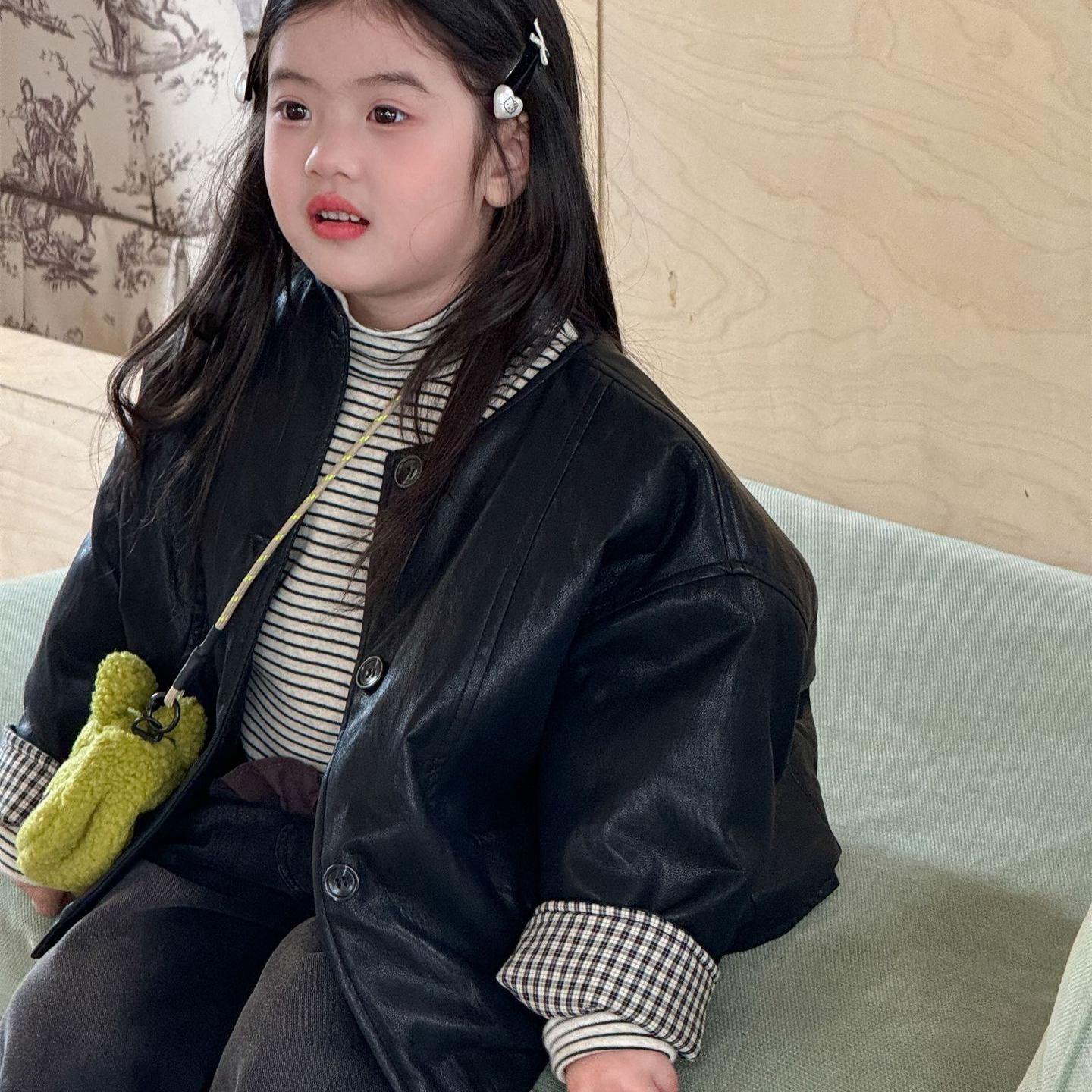 莱抱抱2025秋冬季新款女童夹棉加厚皮衣拼格pu皮衣保暖夹克