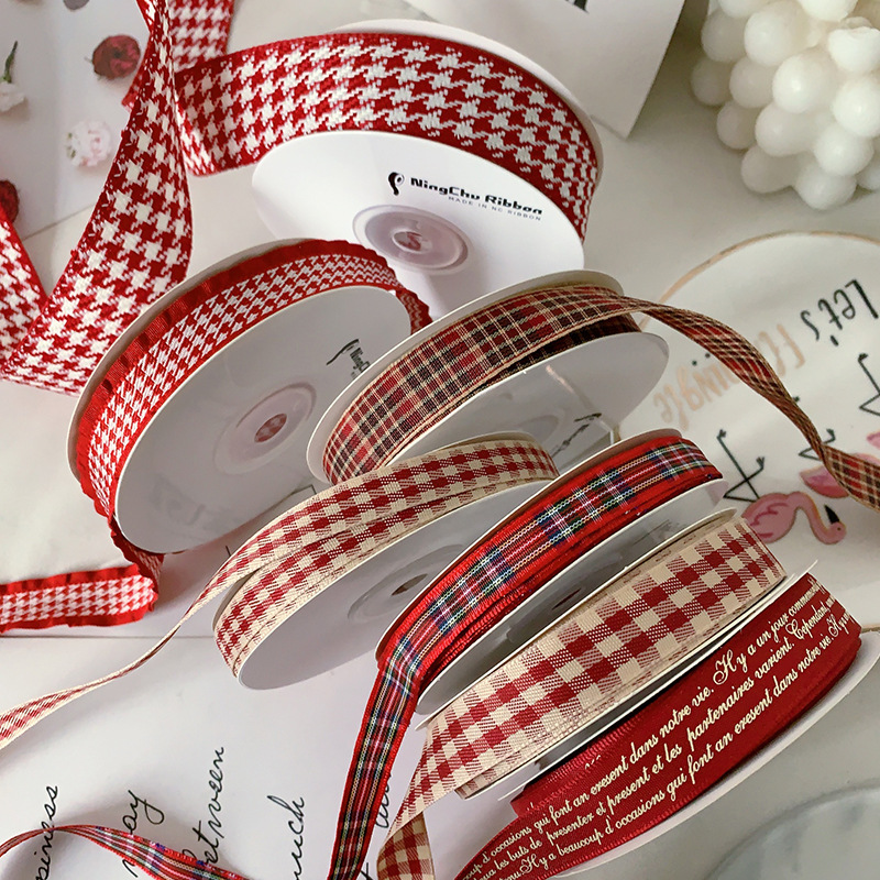 酒红新年格子带丝带花束烘焙diy手工花艺包装材料织带彩带英伦风