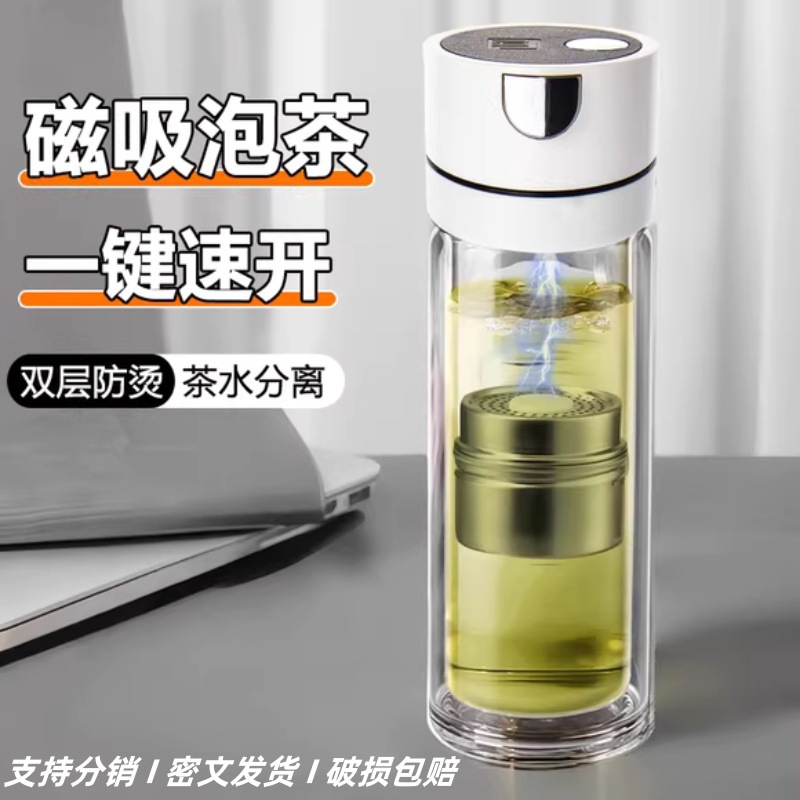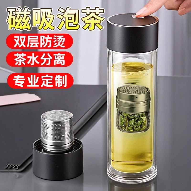 高档磁吸茶水分离杯双层防烫玻璃水杯新款男士泡茶专用磁弹泡茶杯