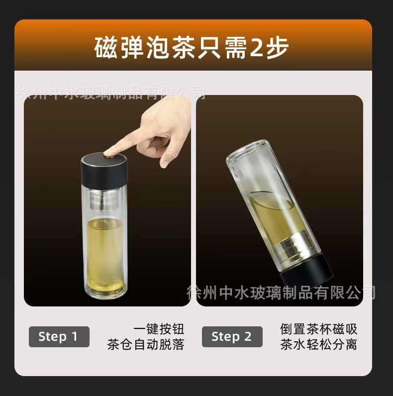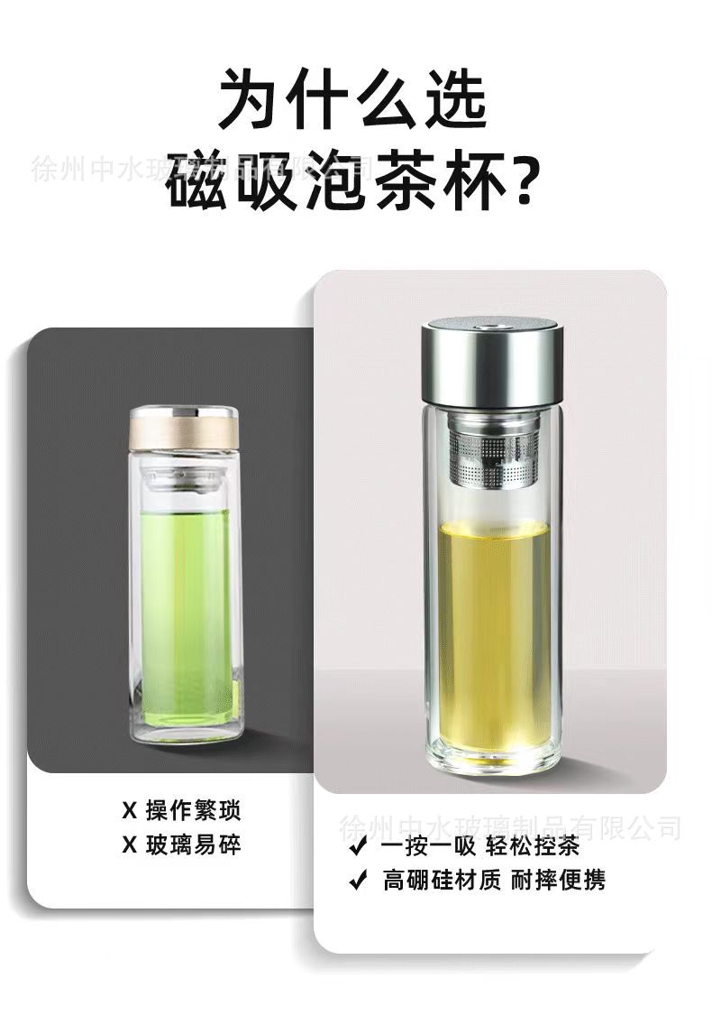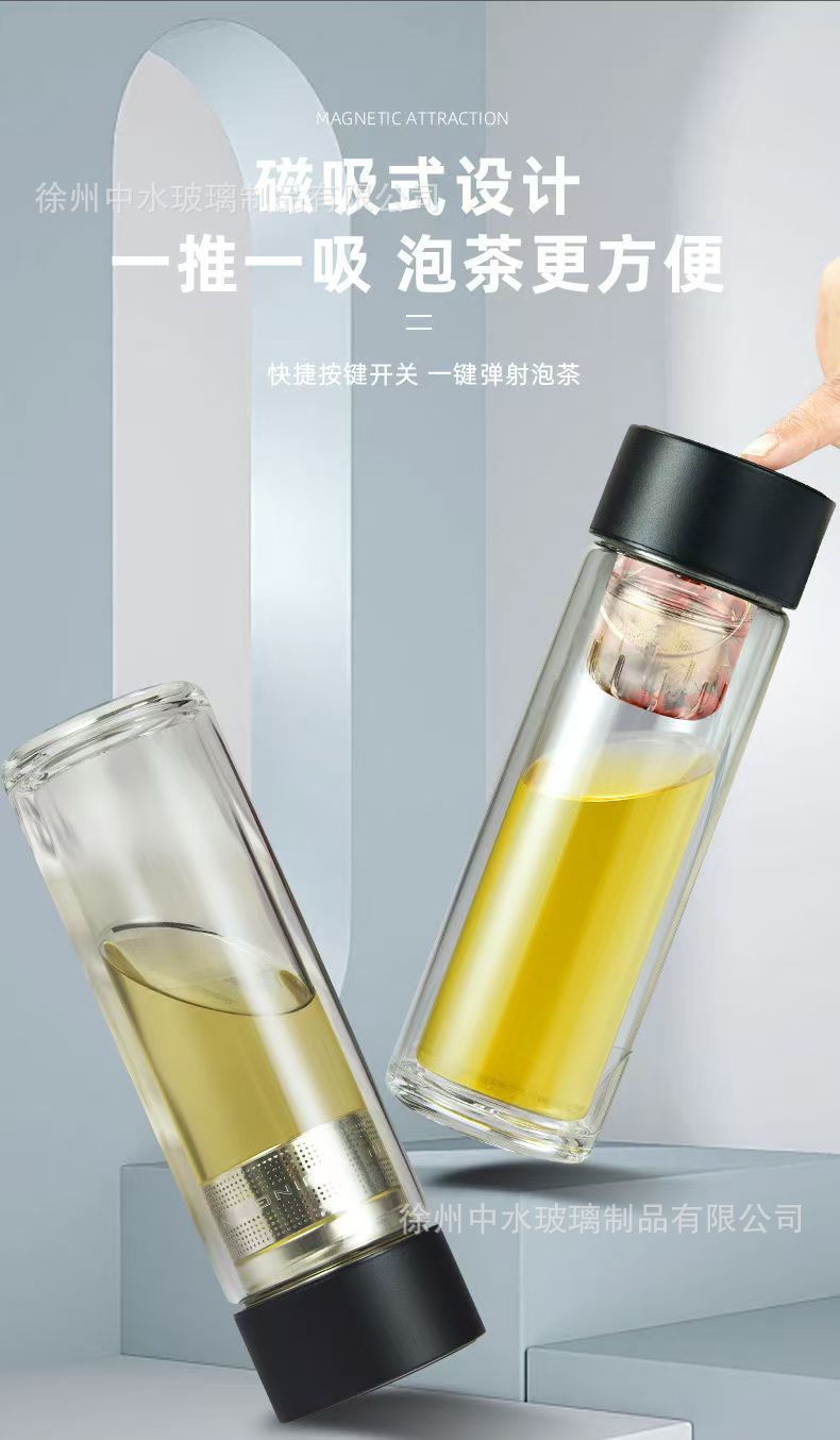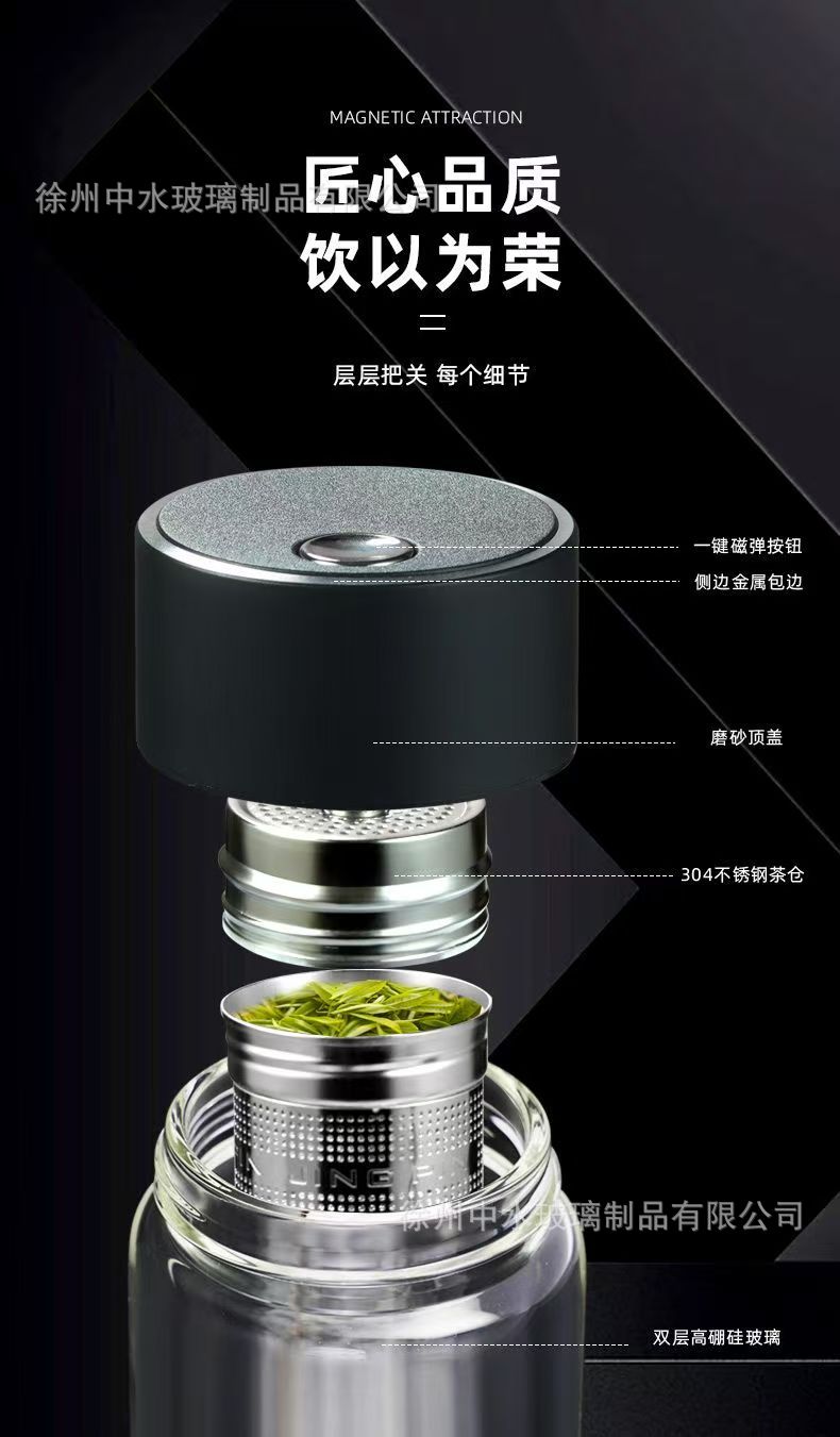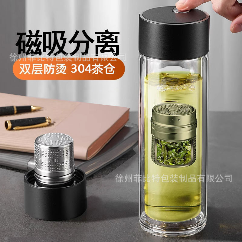 新款磁弹茶杯便携耐高温茶水杯高档分离水杯双层玻璃杯男士上班族