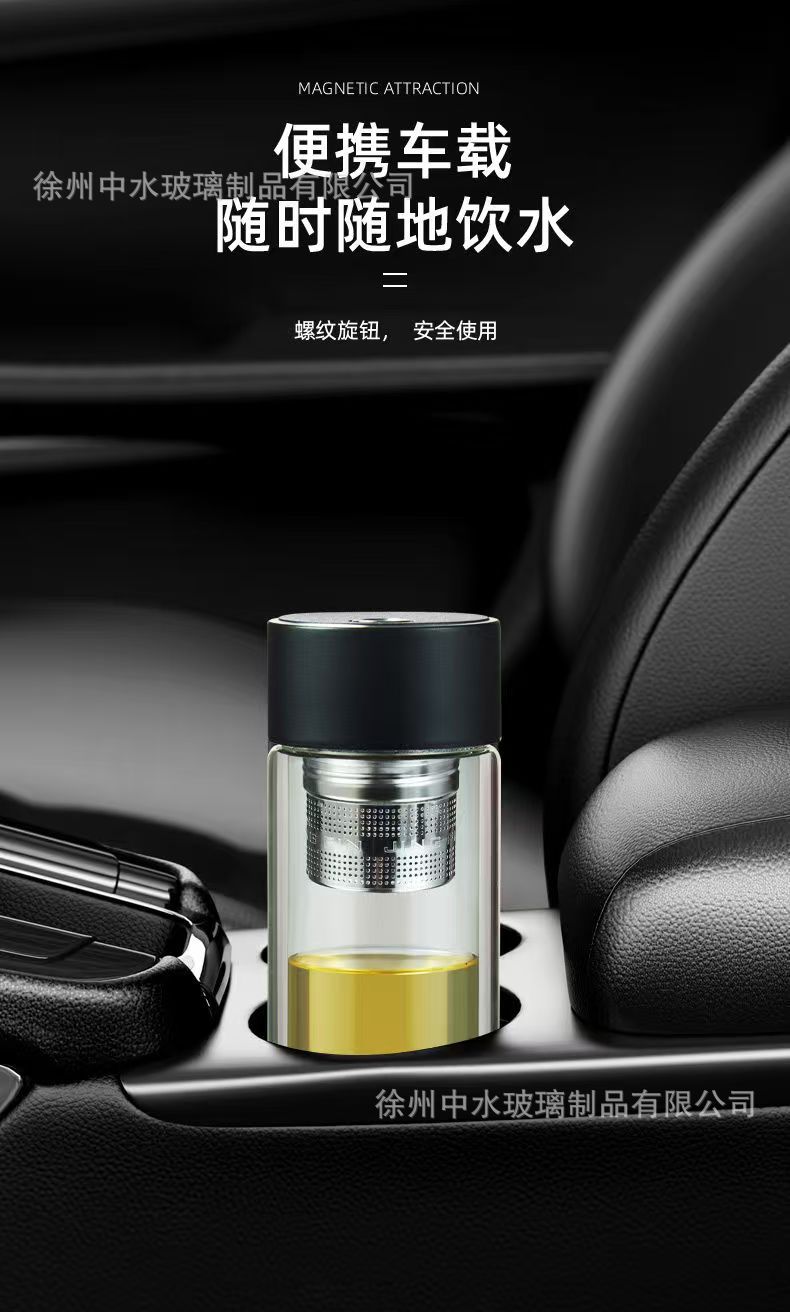二合一ボタン押し式ガラスカップパーマ防止ガラスカップ男二重泡カップ車載磁気吸茶水分離