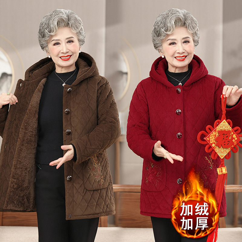 おばあさんの綿入れの冬服のコートの女性のお母さんの冬の新型のベルベットの厚い綿服の70歳の中高年の綿服