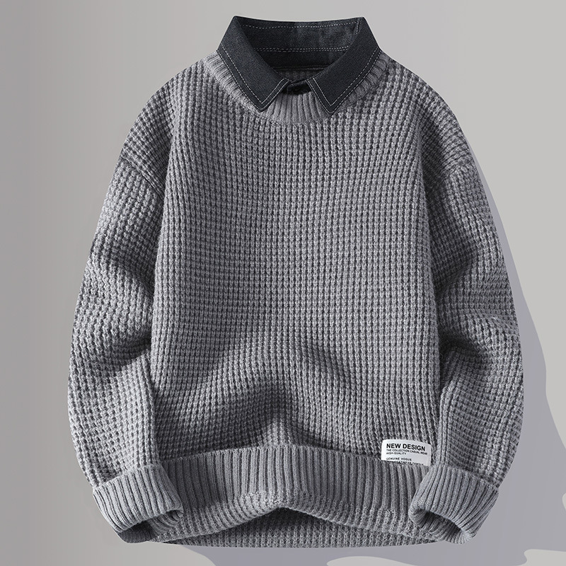 シャツの襟のセーターの男性の秋冬の新型の偽の2枚のニットの男性の冬の服装は厚くて暖かいレジャーの線の服を厚くします。