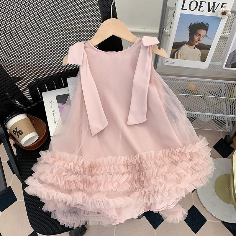 子供の袖なしの立体蝶結びのネットのスカートの王女のスカートの2025夏服の女性の宝の女の子の甘いワンピースのスカート