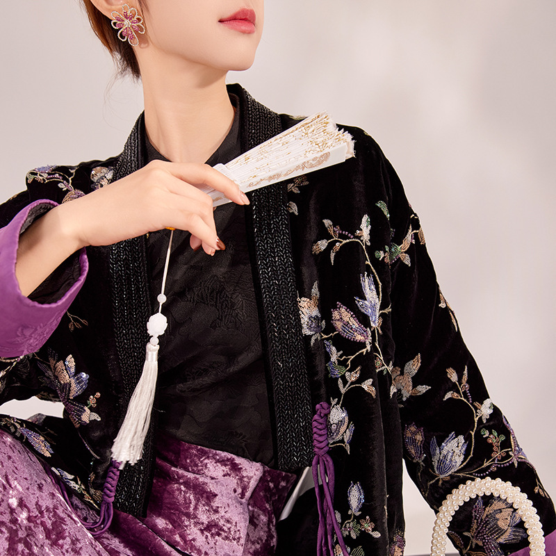 国风黑色圆领盘扣亮片刺绣钉珠外套设计鱼尾半裙新中式套装 N9087