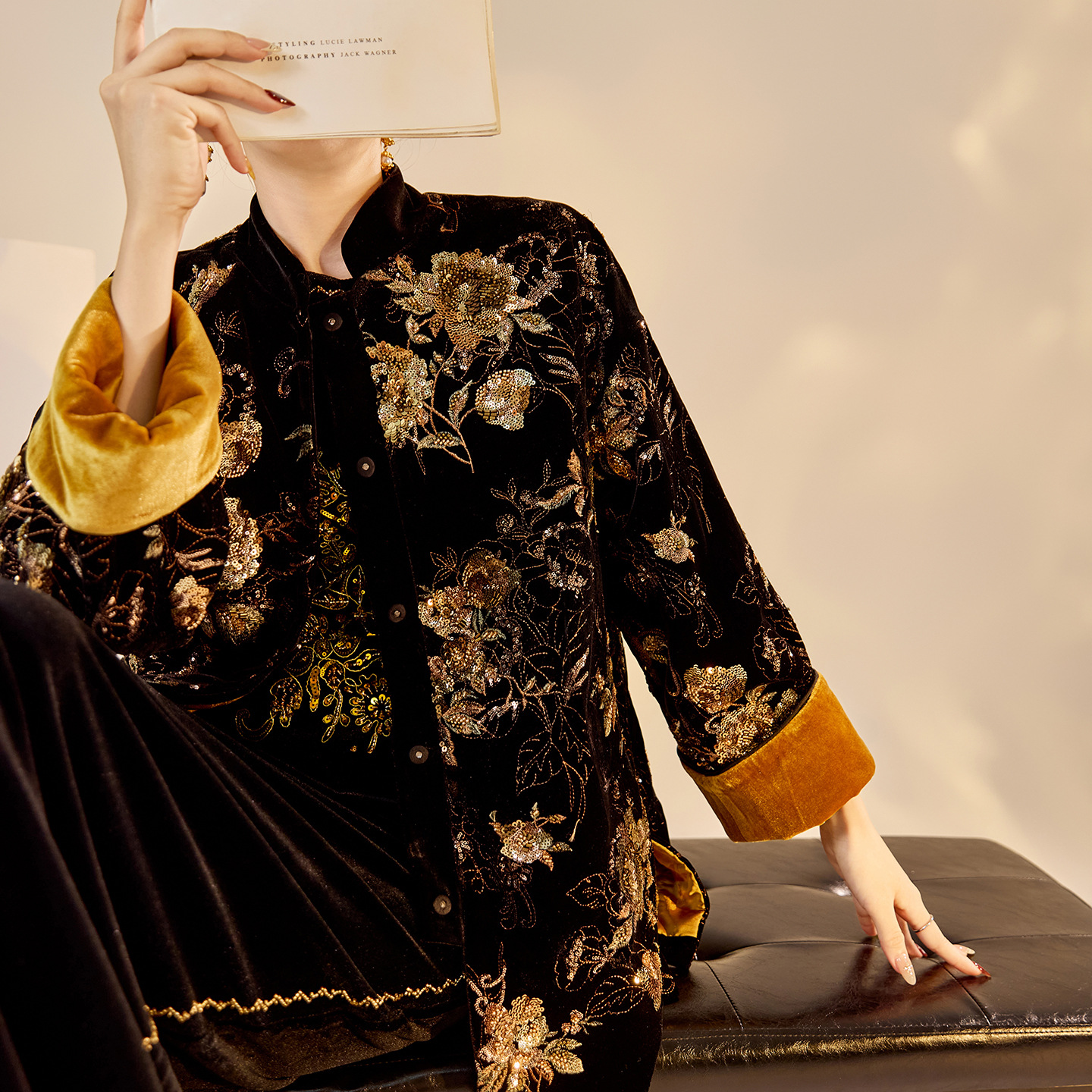 新中式2025秋季新款丝绒轻奢外套女重工艺珠片绣高级感棉服 N9073