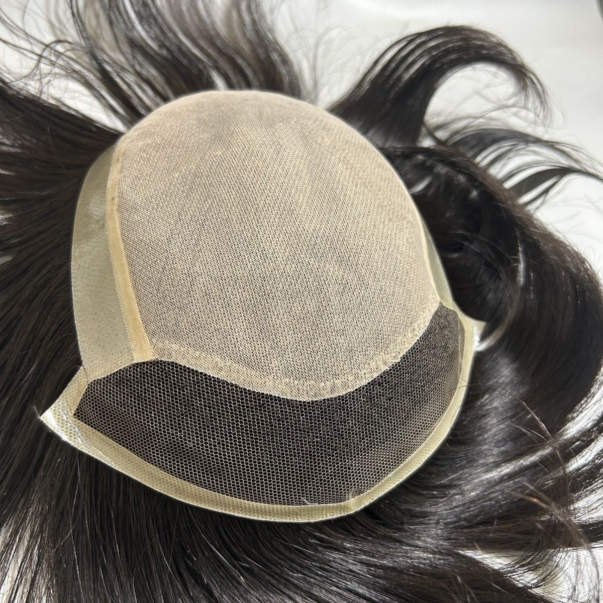 薄型スイスネットウィッグ、フルリプレイスメントニードルウィッグ、男性用軽量スキンヘッド分け目、男性用ダブルニードルフルリアルヘア