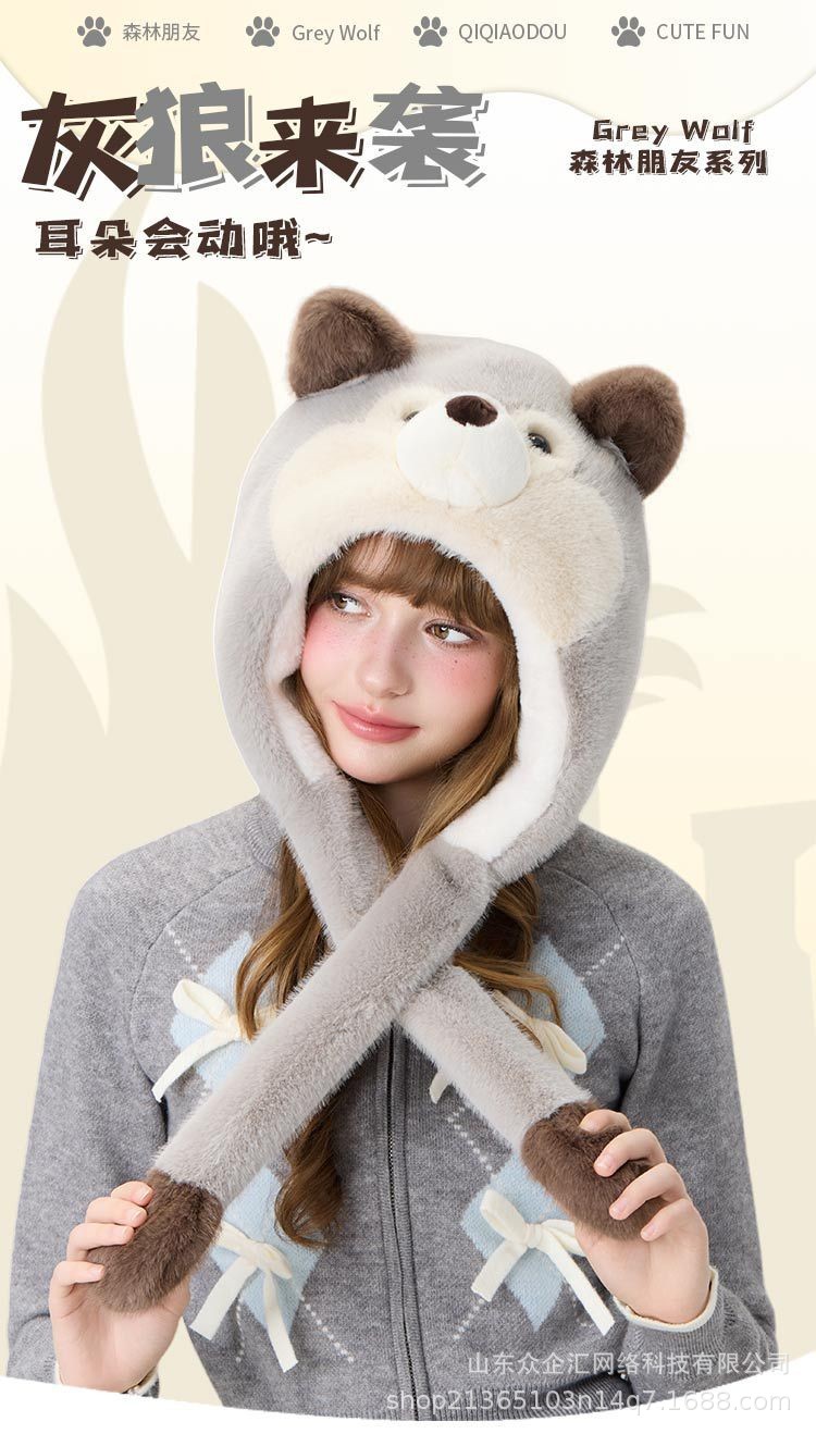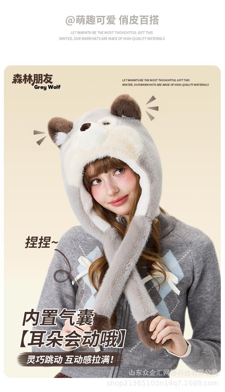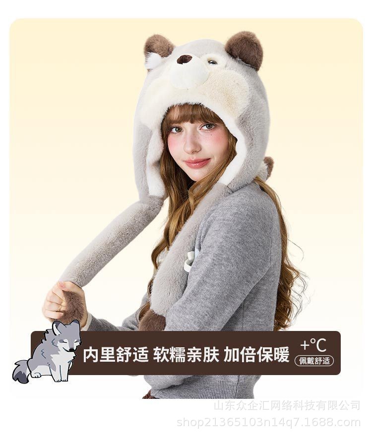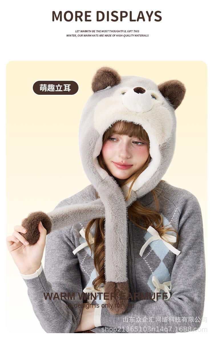 冬用帽子 レディース ふわふわ漫画風小さなアライグマ 新型抖音帽子 可愛い動く耳付き帽子 ふわふわ暖かい耳当て帽子