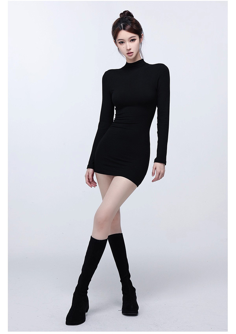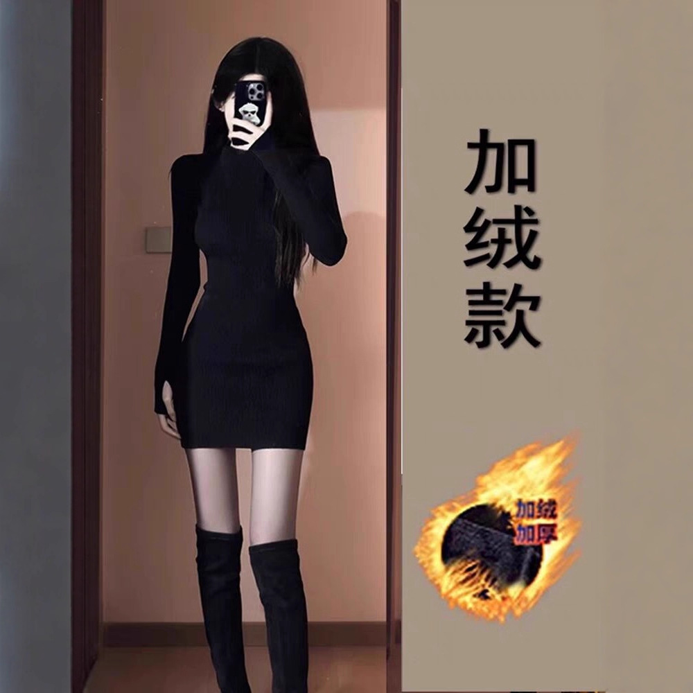 冬季加绒加厚辣妹修身半高领打底裙秋冬内搭包臀短裙长袖连衣裙