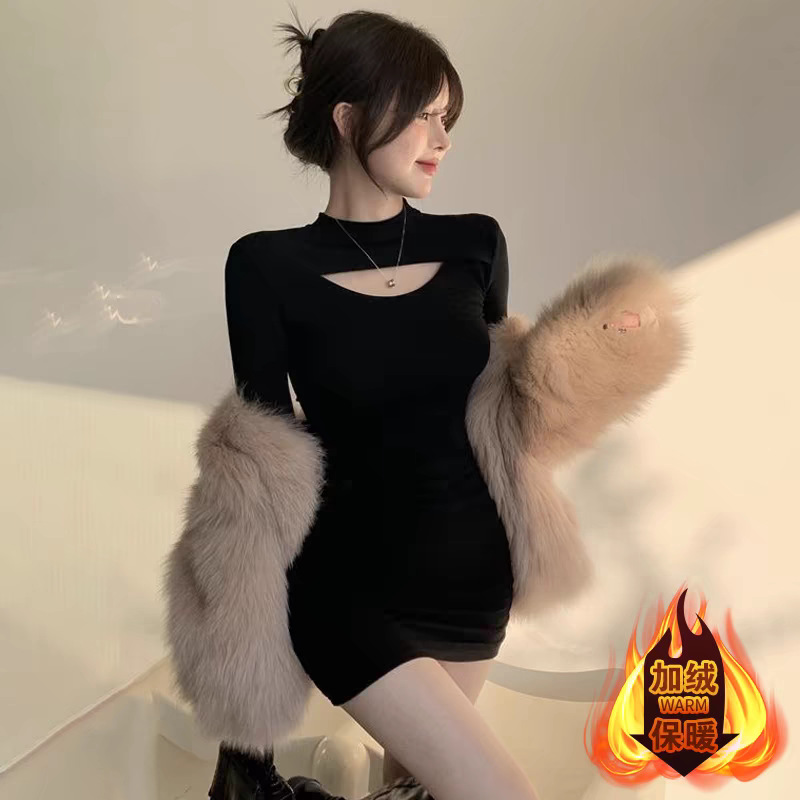 黑色秋冬季皮草内搭包臀连衣裙加绒加厚辣妹修身大衣打底短裙子
