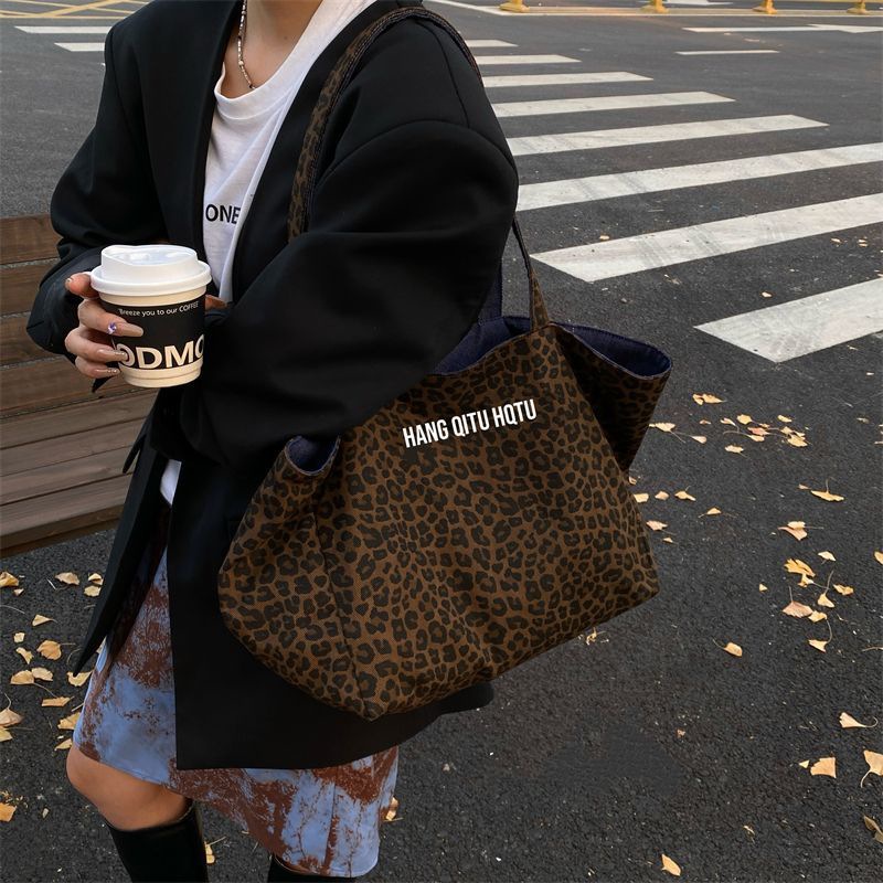 韩系双面豹纹帆布包女新款牛仔休闲慵懒风单肩包大容量通勤托特包
