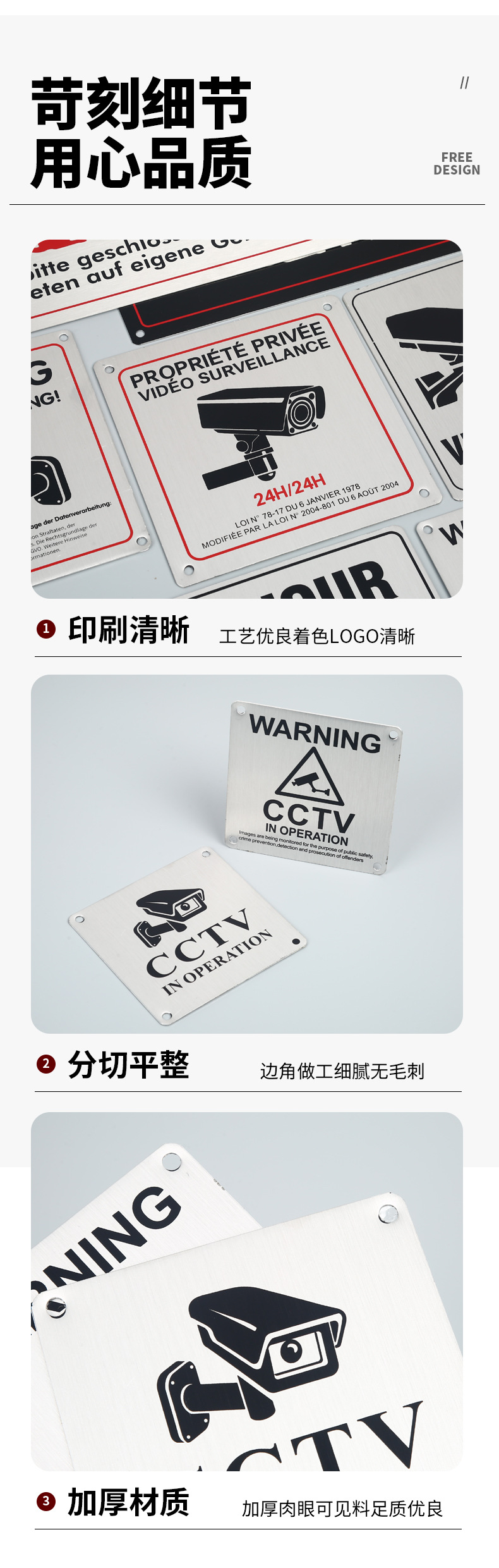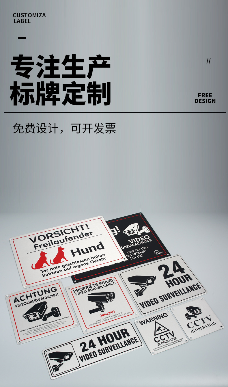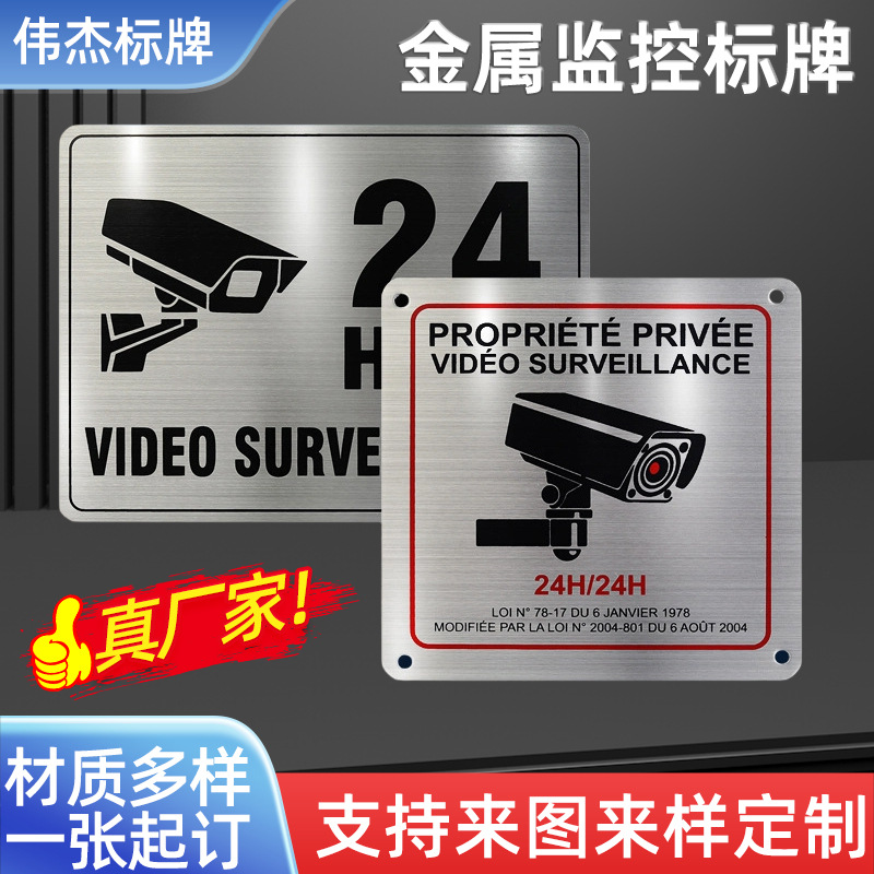 跨境亚马逊金属标牌监控设备警示牌不锈钢丝印冲压腐蚀标牌本色