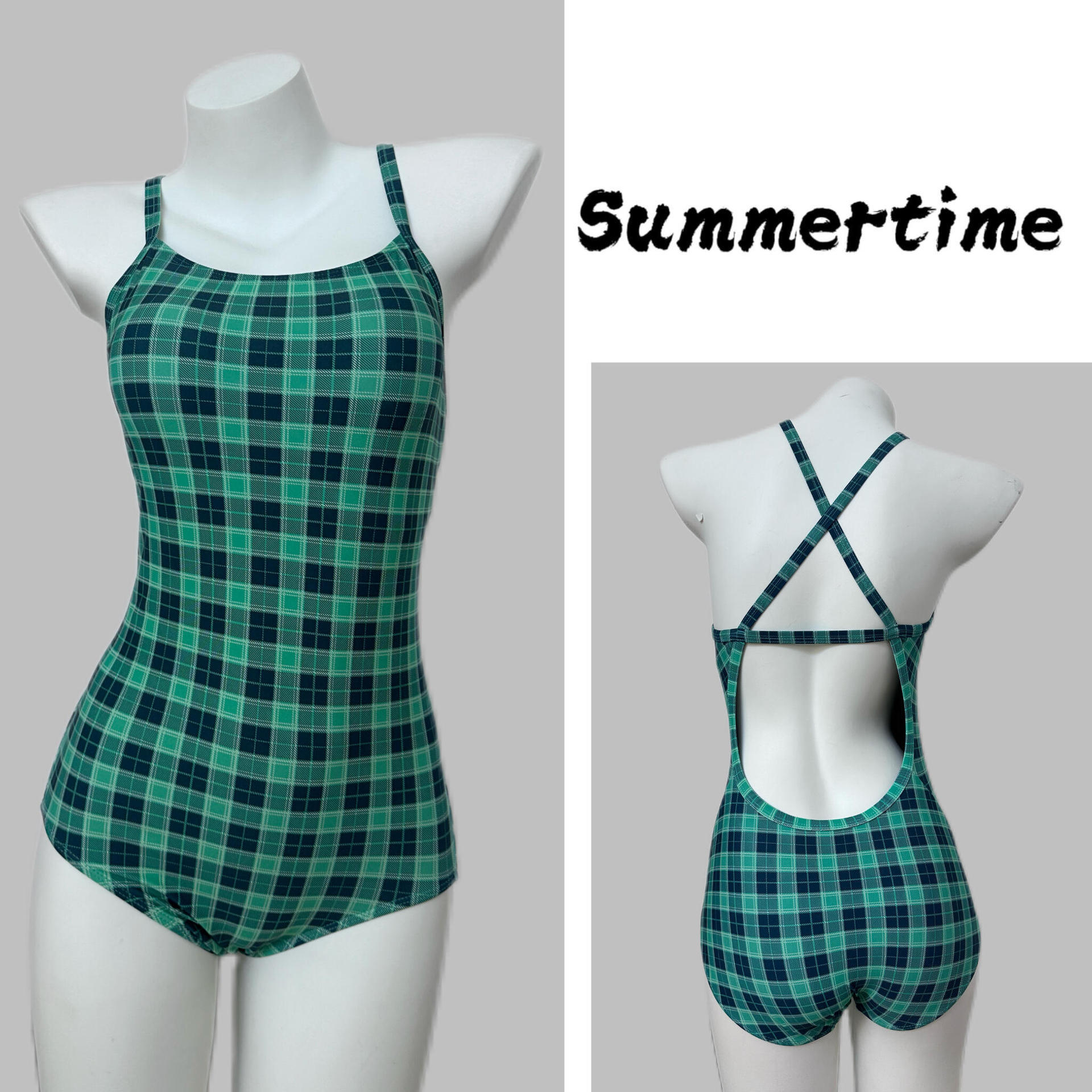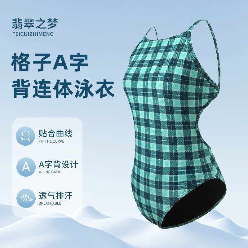 翡翠之梦格子A字背连体泳衣复古绿显白显瘦专业运动竞速微胖大码