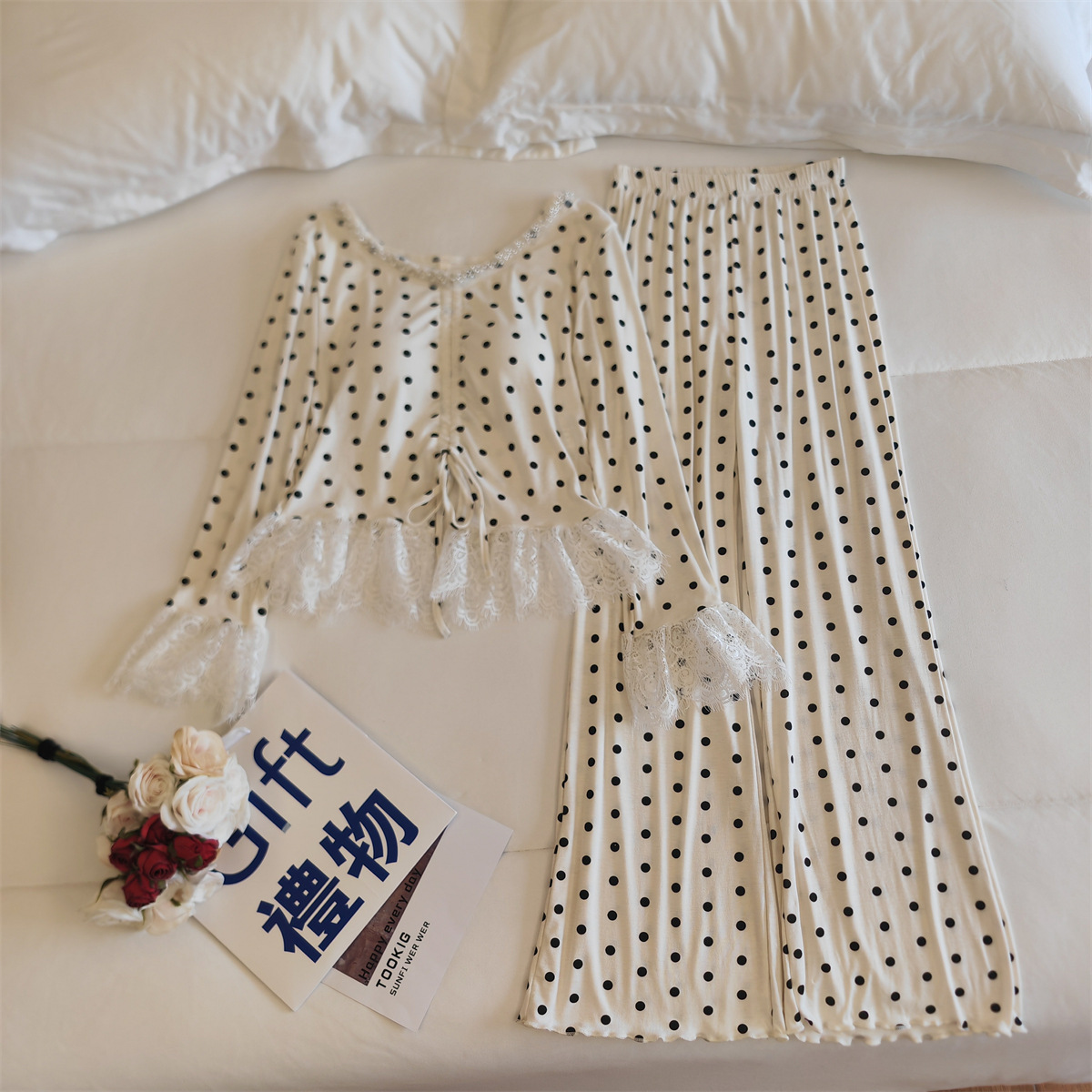 韓系波点パジャマ女性春秋長袖胸パッド付きの薄いネットレッド風モーダルホームウェアセット