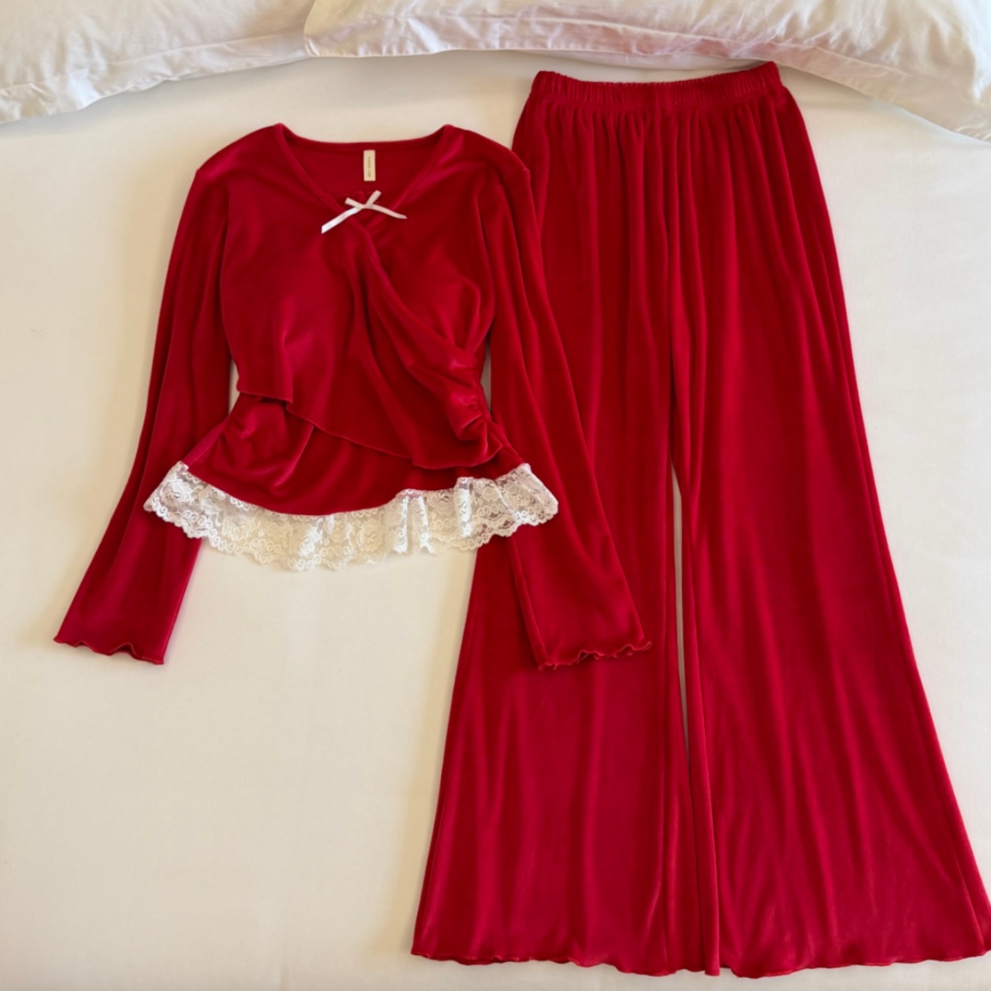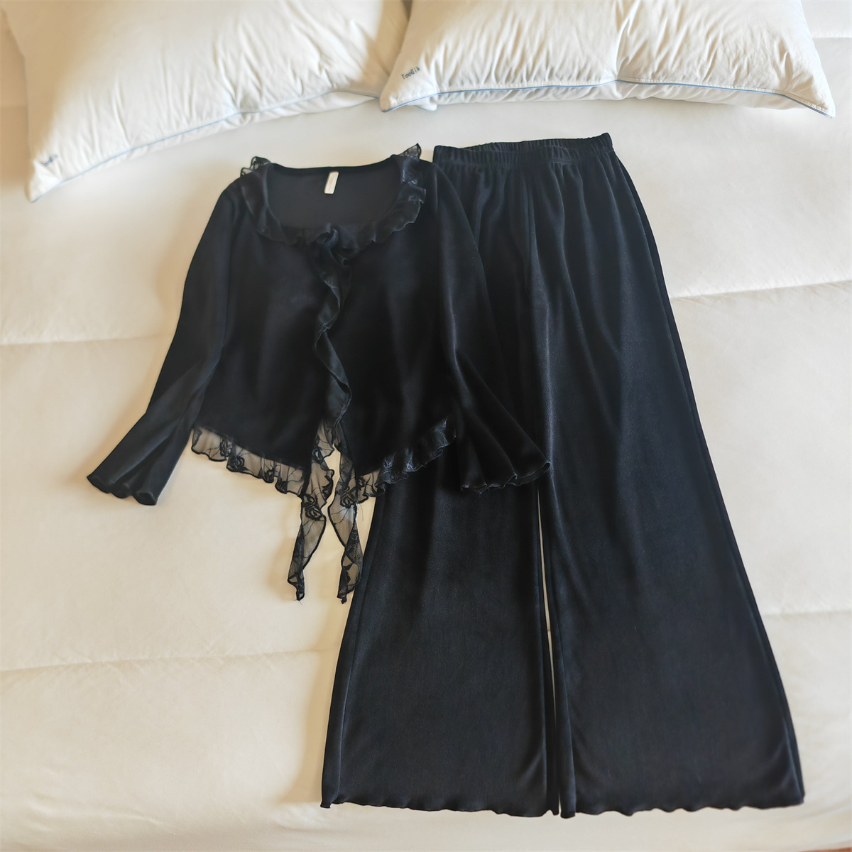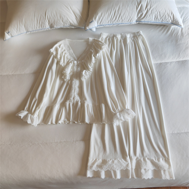 春秋パジャマ女性2025モーダルv襟純欲風セクシーレース家庭服二点セットファッション外着可
