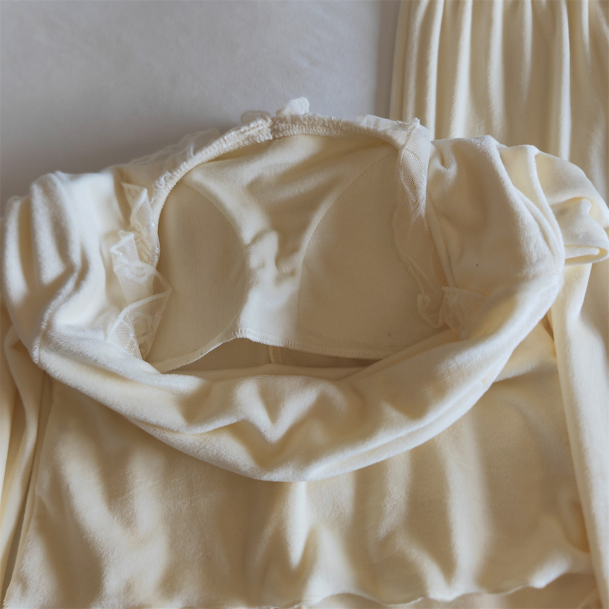 海岛绒睡衣女春秋冬季蕾丝边长袖长裤亲肤暖绒带胸垫家居服两件套
