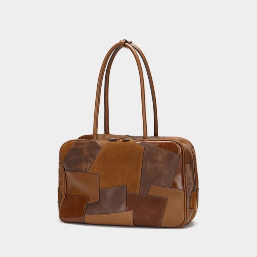 トップ層の牛革はボーリングバッグをつなぎ合わせて、国境を越えた新商品iu家のレトロな本革女性バッグの大容量ボストンバッグです。