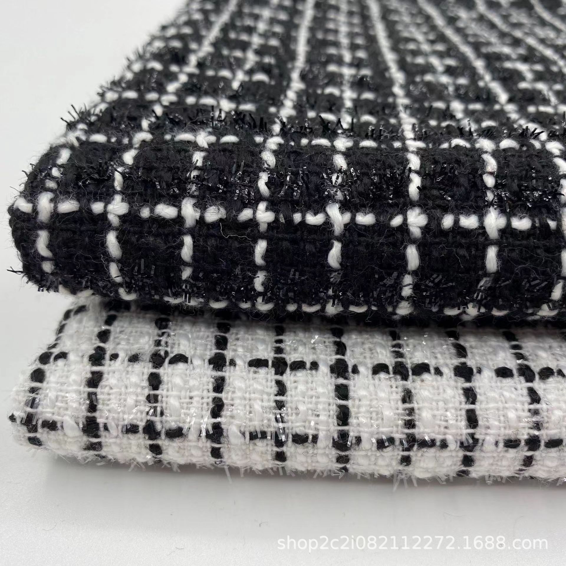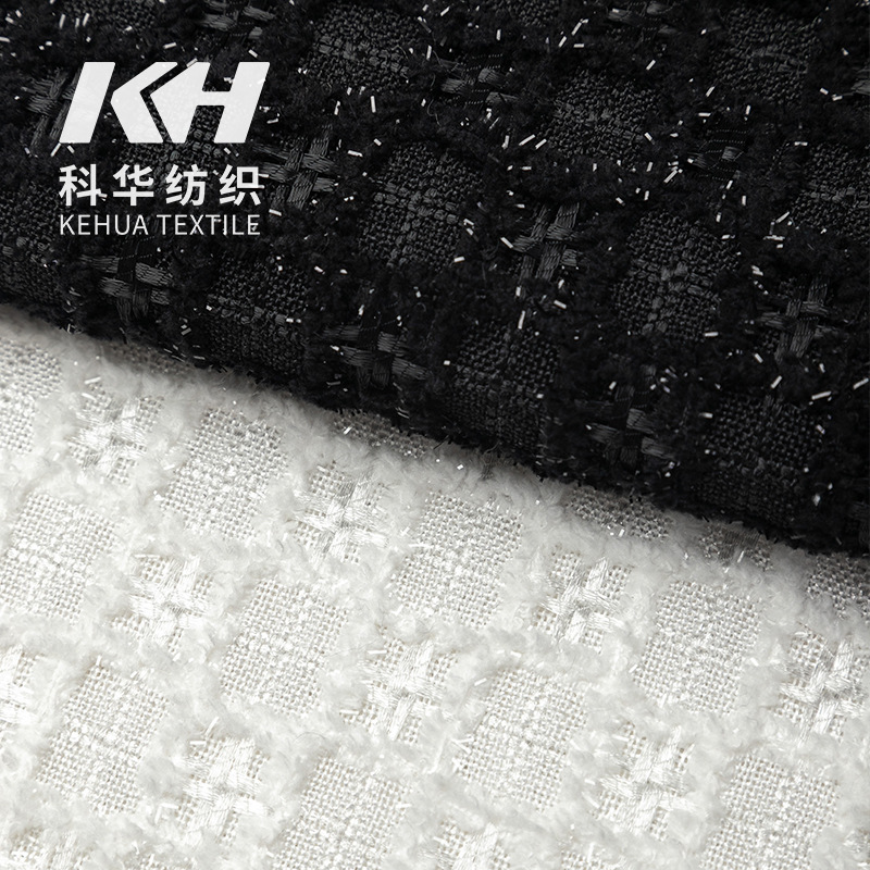 小香風生地粗織織り粗花は白黒格子金糸コートスカートセットバッグ布卸売り