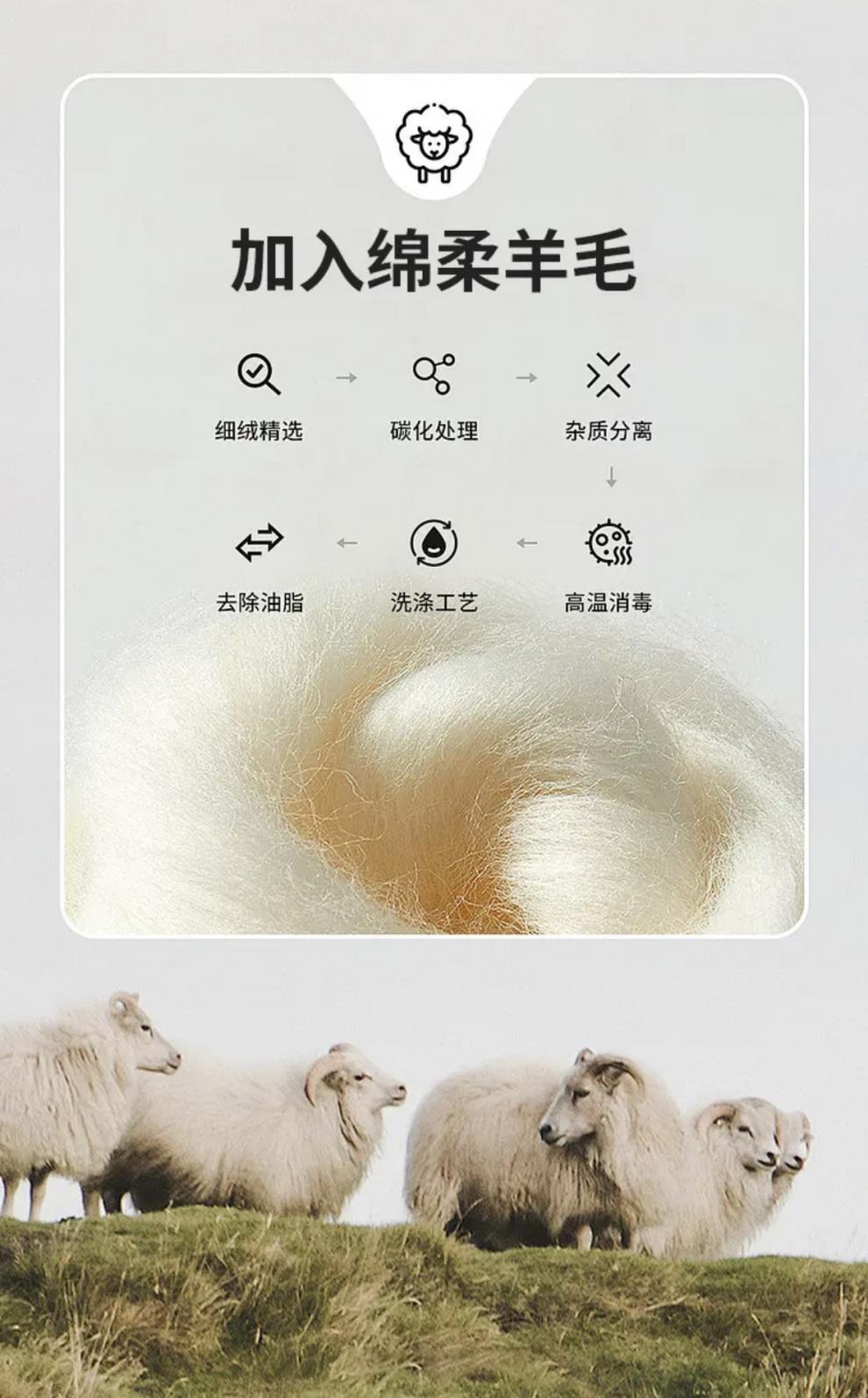 内里卖点2,内里面料采用,上乘绵羊毛材质,羊毛➕蚕丝,发热黑科技,内在蓄热,持久锁温,发热亲肤,滋养肌肤!