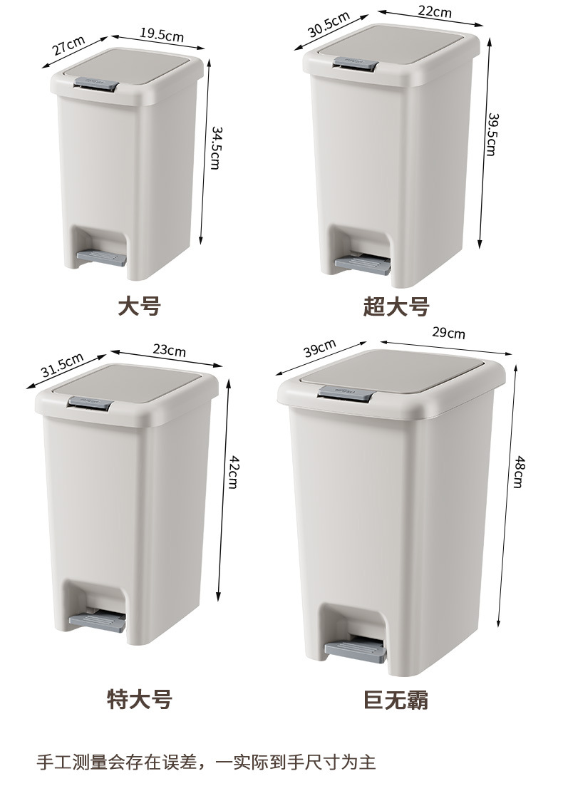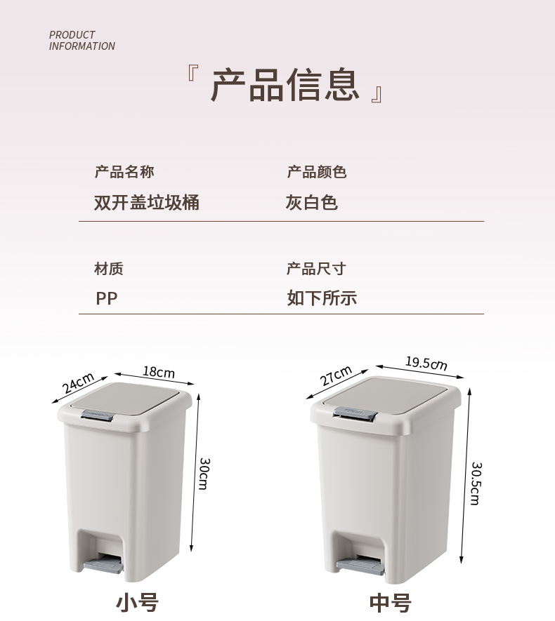 颜色 【小号6.5L】双开脚踏垃圾桶,中号8L】双开脚踏垃圾桶,【大号10L】双开脚踏垃圾桶,【超大号15L】双开脚踏垃圾桶,【特大号20L】双开脚踏垃圾桶,【巨无霸30L】双开脚踏垃圾桶