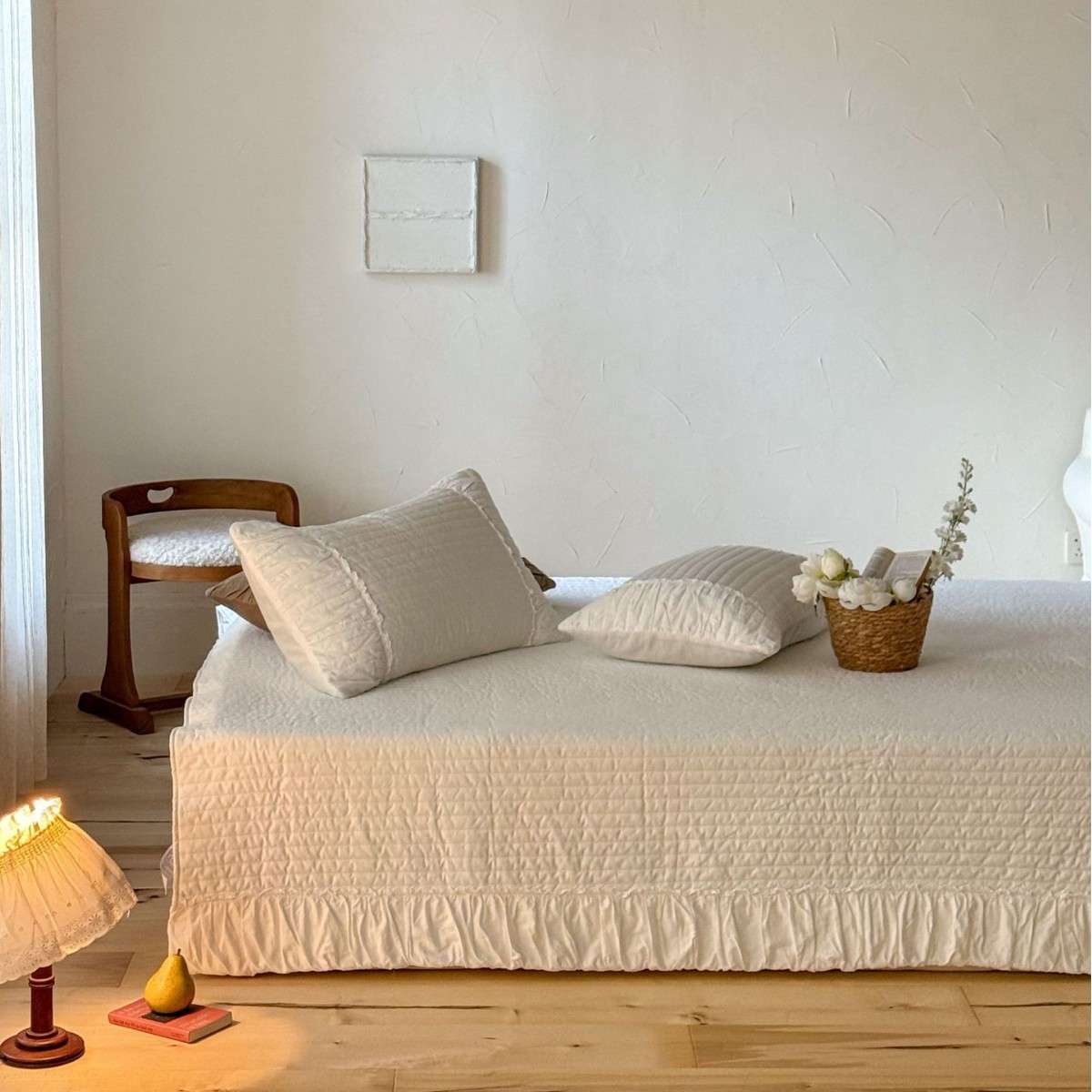 韩国高端60支全棉砂洗绗缝花边床盖三件套法式夹棉床单四季通用++