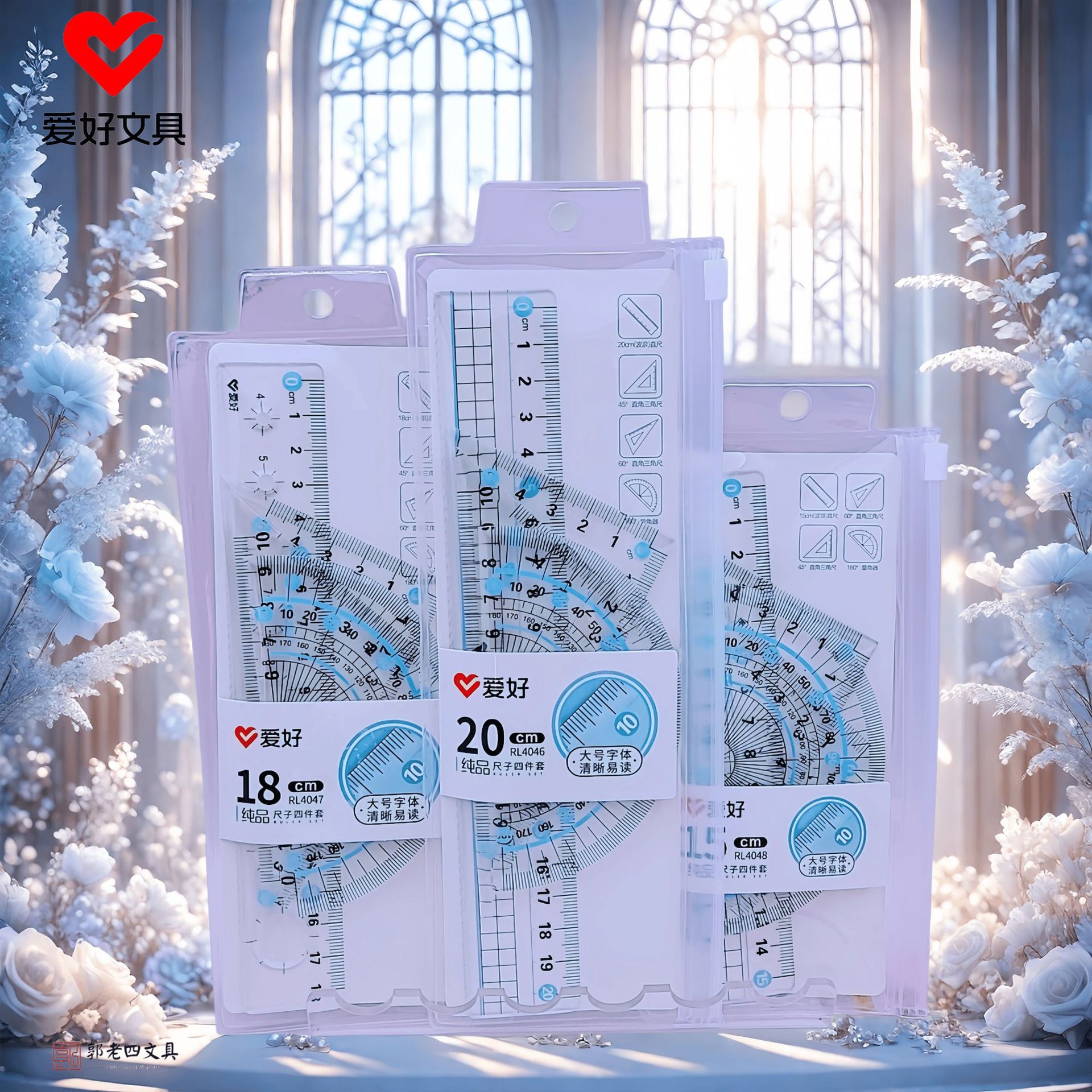 爱好文具新品多功能尺子四件套学生大字体直尺量角器三角尺批发