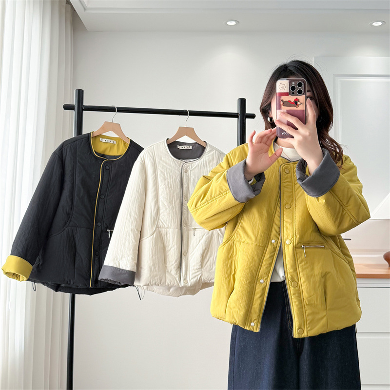 2025秋冬大码撞色棉服女圆领小众时尚棉袄显瘦小众胖妹棉衣8321