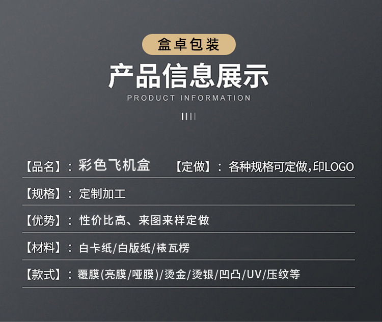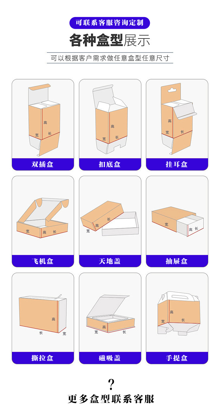 规格型号 定制飞机盒;先咨询客服再下单,定制手提盒;先咨询客服再下单,定制抽屉盒;先咨询客服再下单,定制开窗盒;先咨询客服再下单,定制瓦楞盒;先咨询客服再下单,定制天地盖盒;先咨询客服再下单,定制书刊盒;先咨询客服再下单,定制双插盒;先咨询客服再下单,定制挂钩盒;先咨询客服再下单
