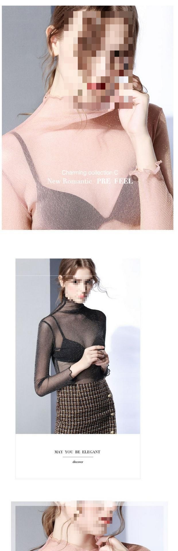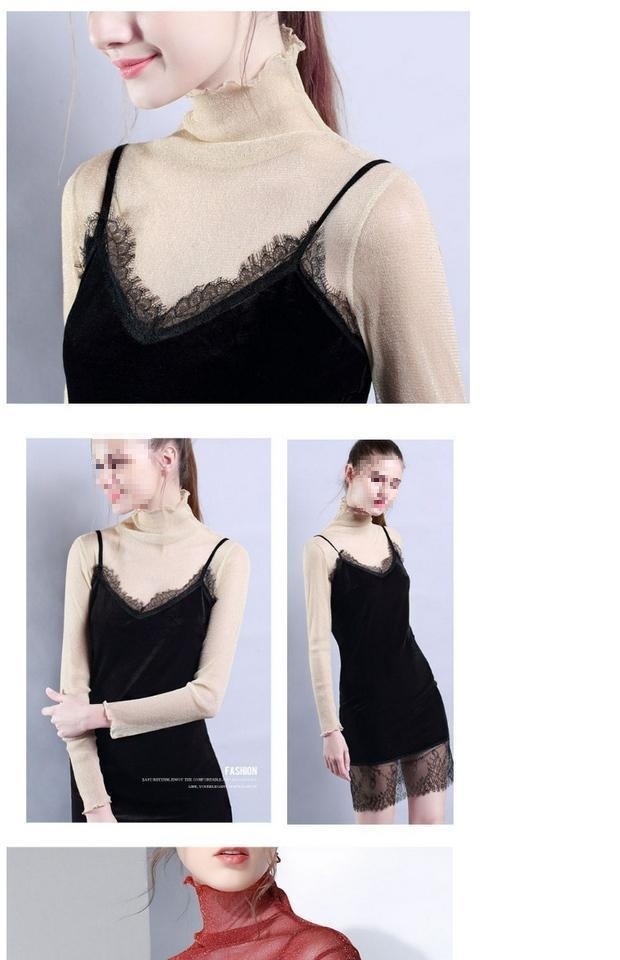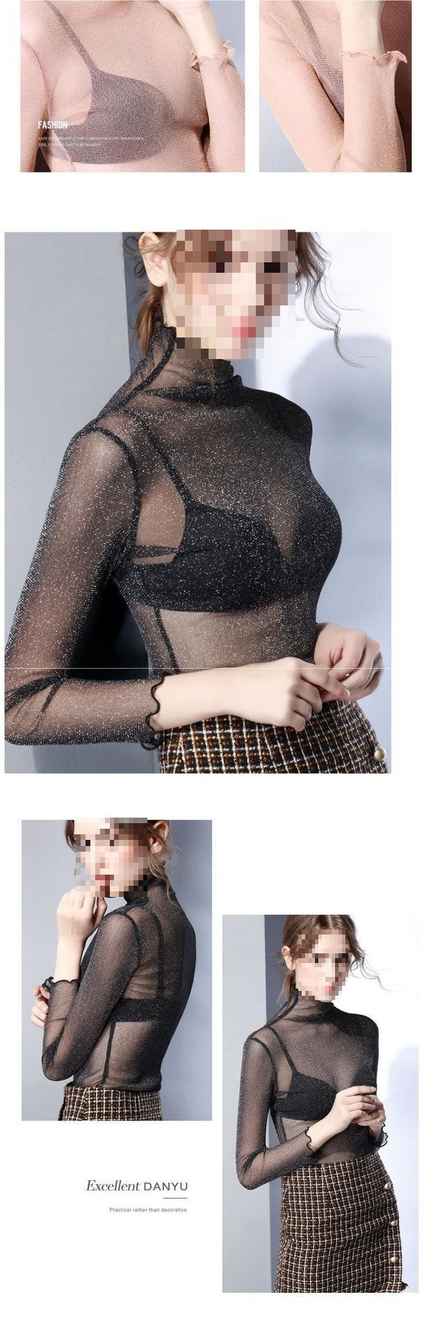 高领网纱打底衫单层透明长袖内搭恤秋季边亮丝上衣