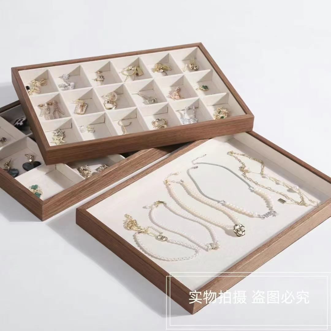ハイエンドの木製ジュエリートレイ、ネックレスジュエリーディスプレイトレイ、リングブレスレット収納ジュエリーディスプレイ小道具