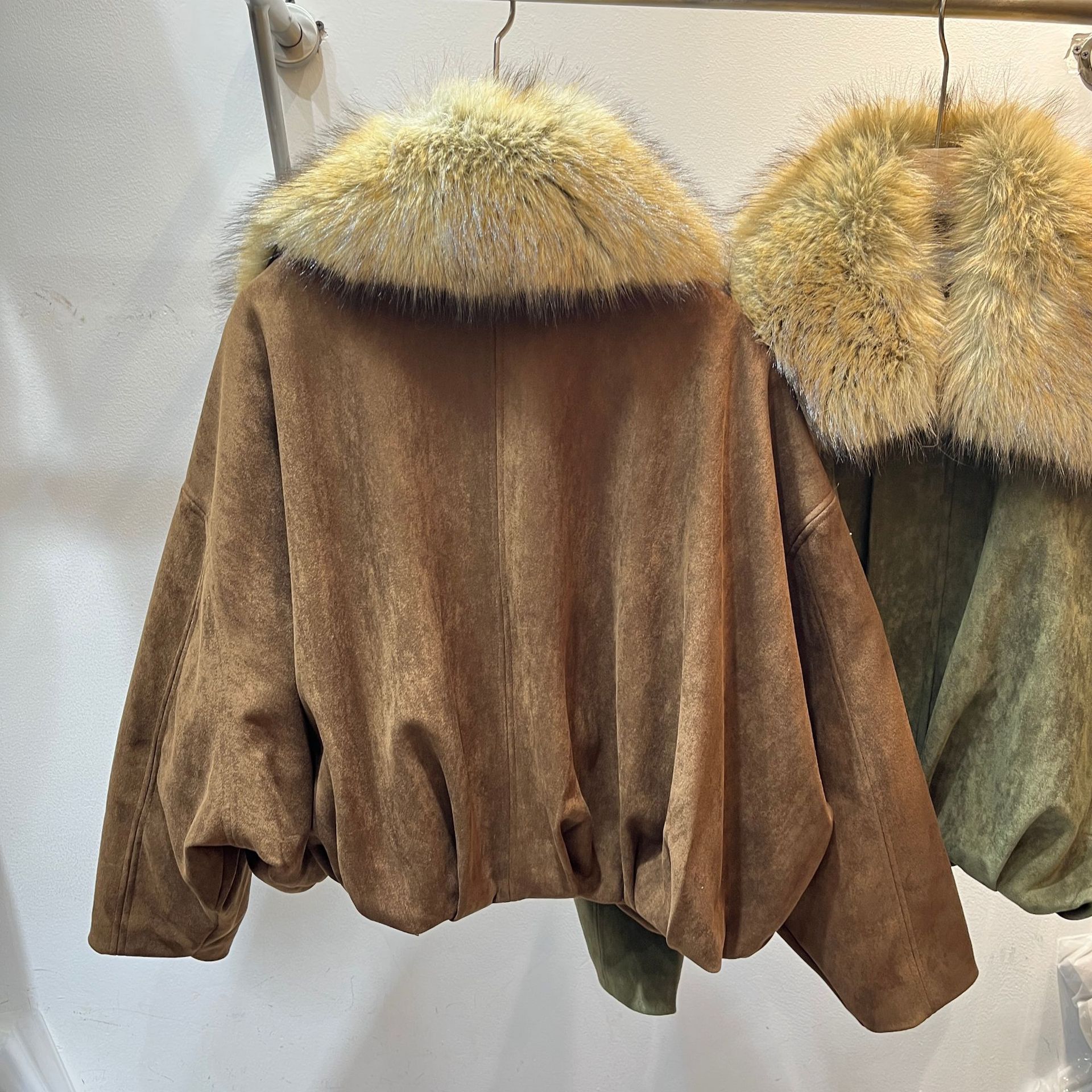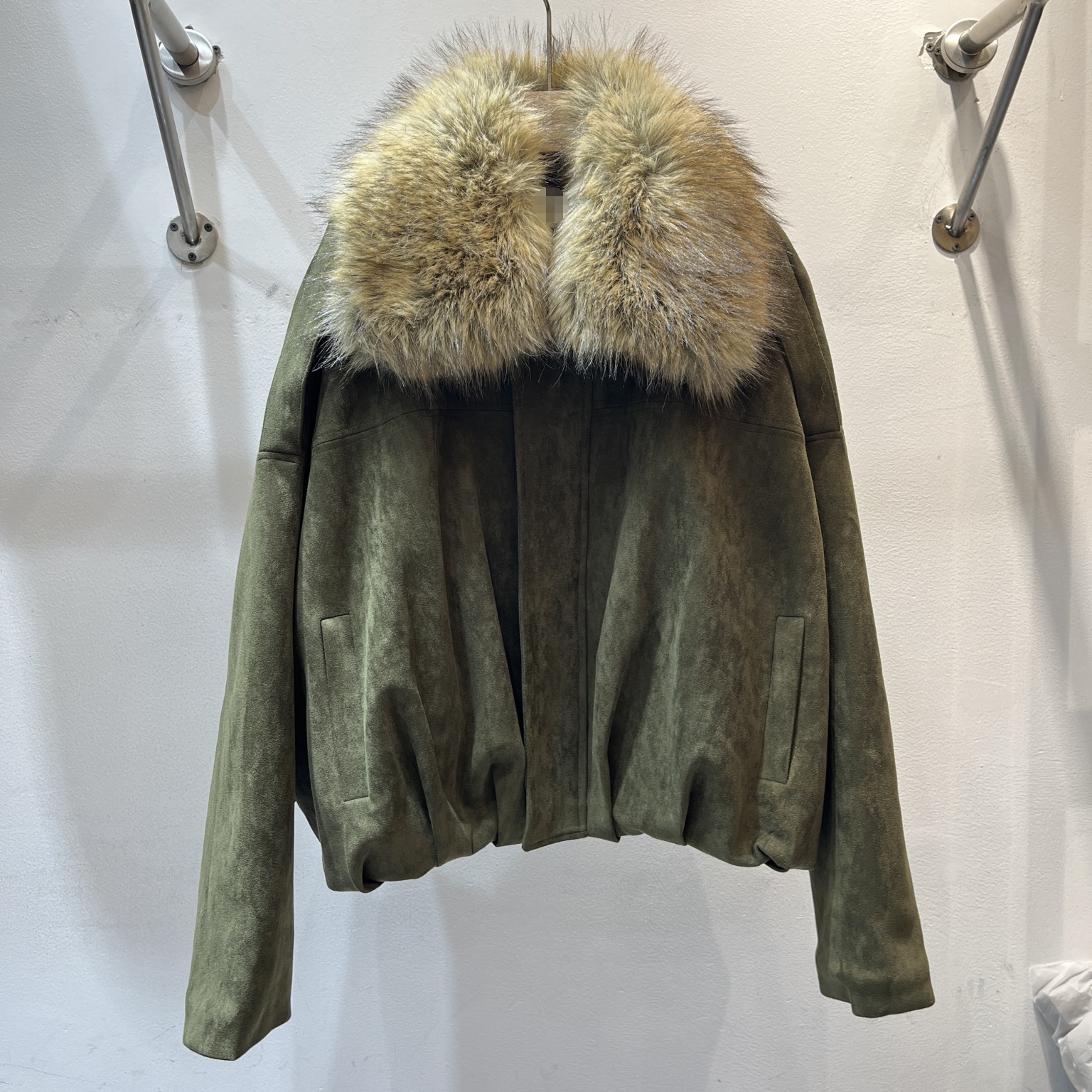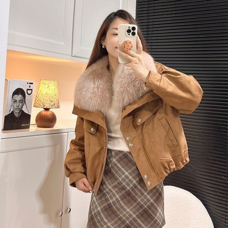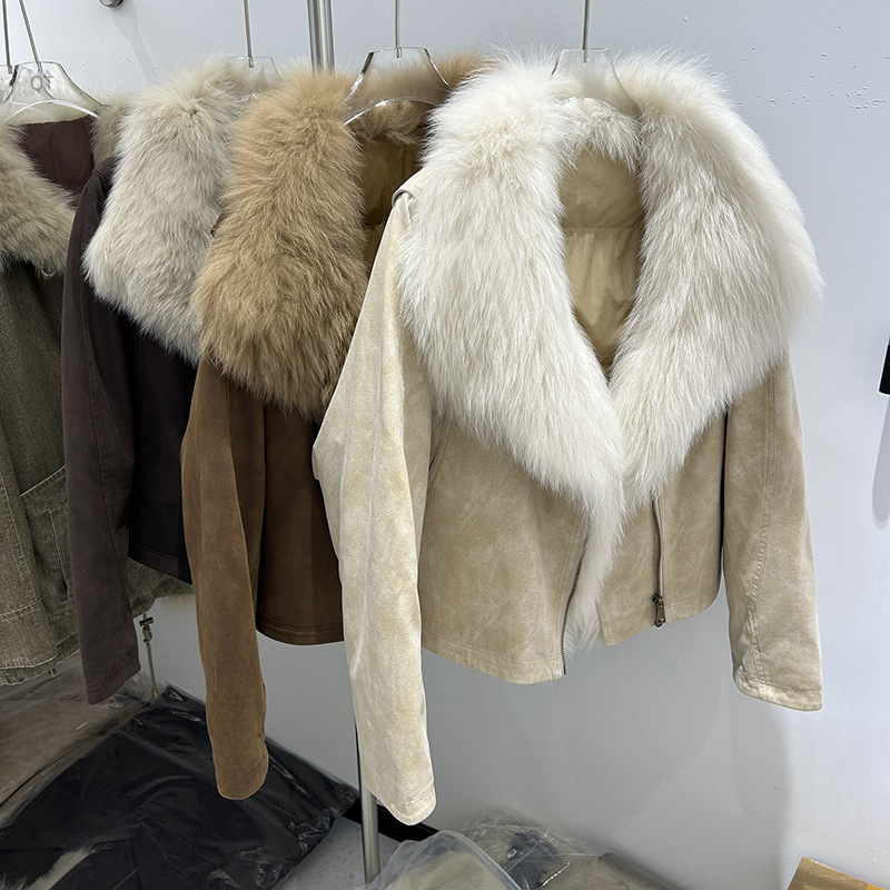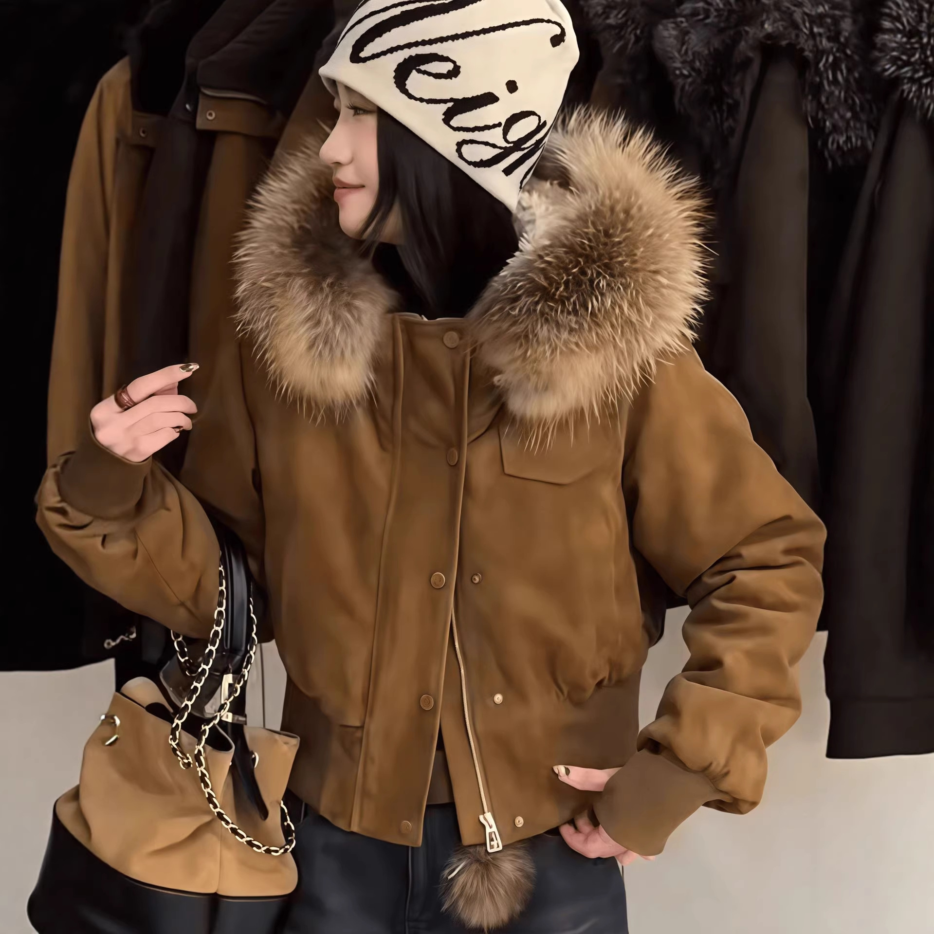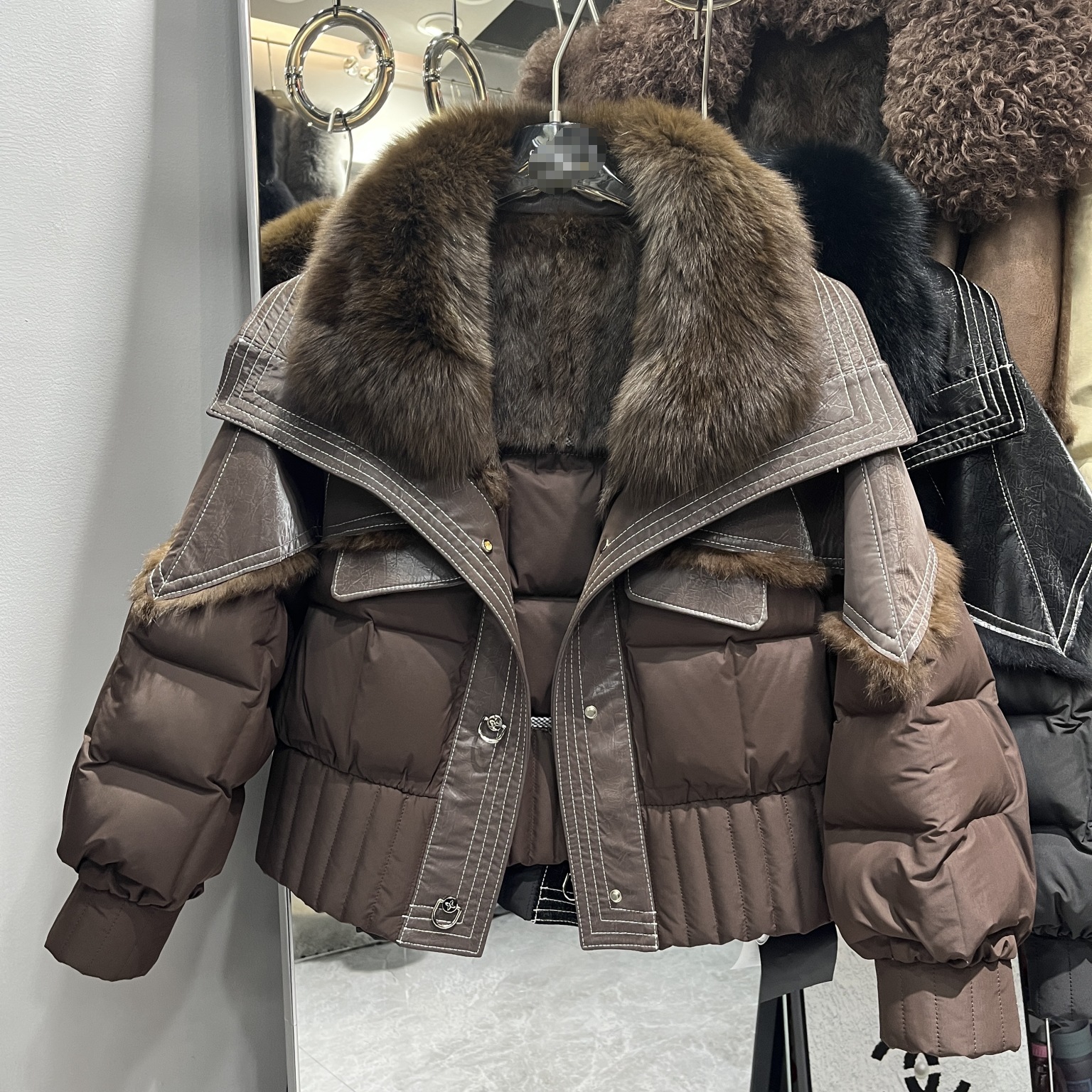 欧货轻奢时尚狐狸毛短款皮草麂皮绒短保暖白鸭绒外套派克羽绒服女