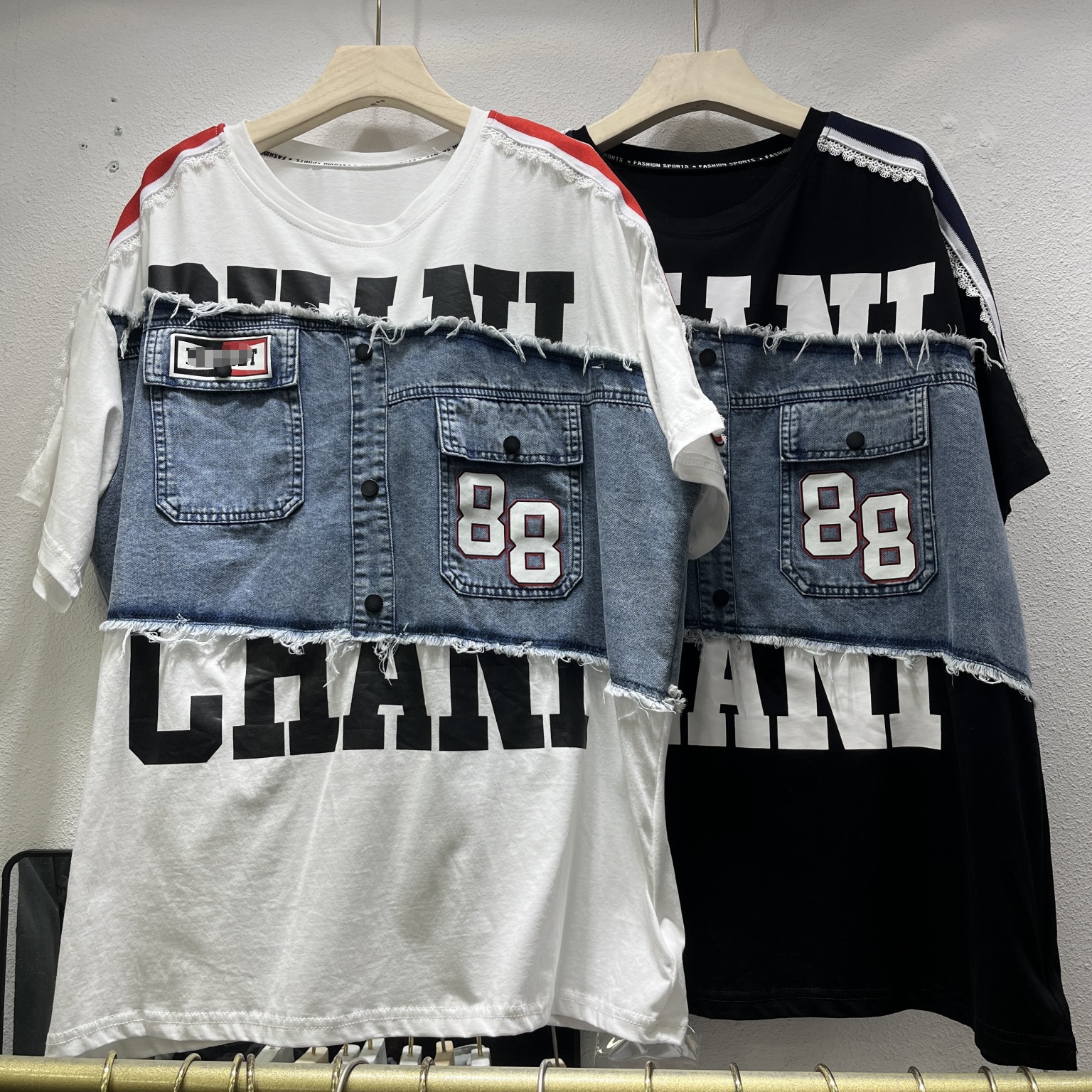 ヨーロッパのtシャツの女性2025夏の新型のゆったりした上着はデニムのアルファベットのプリントの中の長い袖のtをつなぎ合わせます。