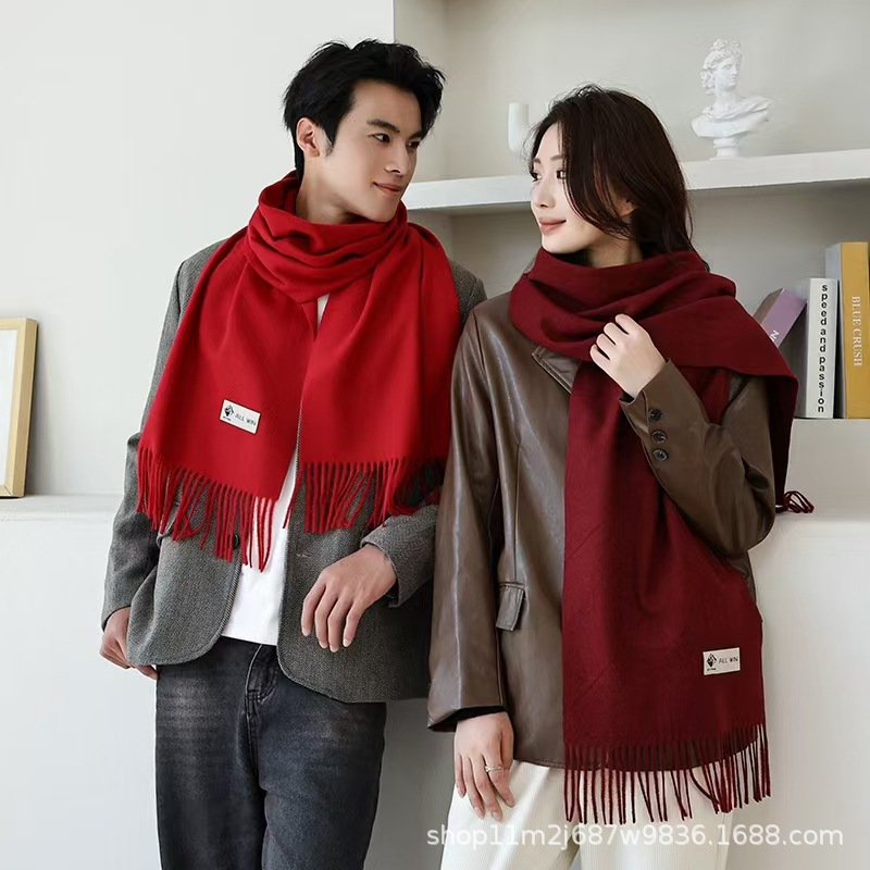 年会の赤いカシミヤのマフラーは冬に保温金のカップルの純色のマフラーを厚くします。