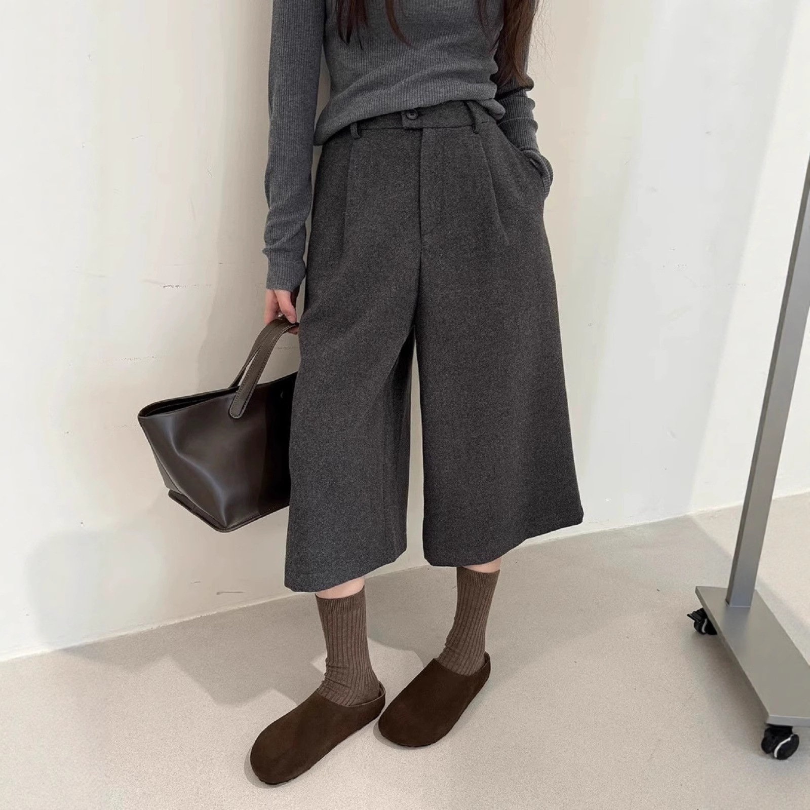 ダークグレーのウール素材の暖かいカジュアルスタイルの五分丈パンツ 女性用 2025春秋冬新作 韓国風 エレガントで大人っぽいパンツ