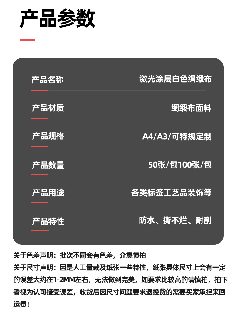 规格型号 激光涂层白色绸缎布;A4(20张),激光涂层白色绸缎布;A4(100张),激光涂层白色绸缎布;A3(20张 ),激光涂层白色绸缎布;A3(100张 )