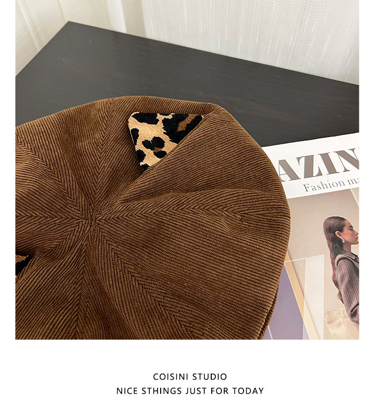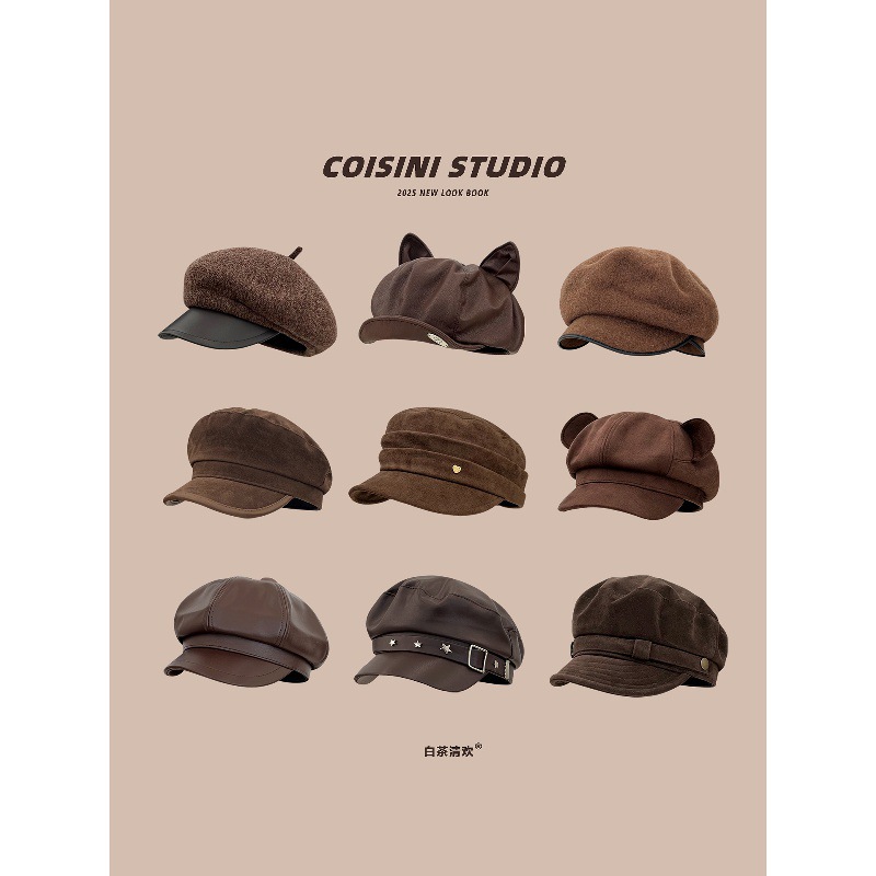 2025新款复古棕色平顶八角帽子女秋冬季气质百搭可爱耳朵贝雷帽潮